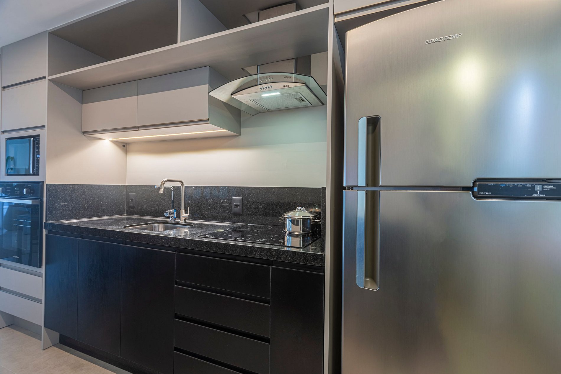 A cozinha, integrada à sala de estar, está equipada com aparelhos modernos e oferece um ambiente prático e funcional para preparar suas refeições favoritas.