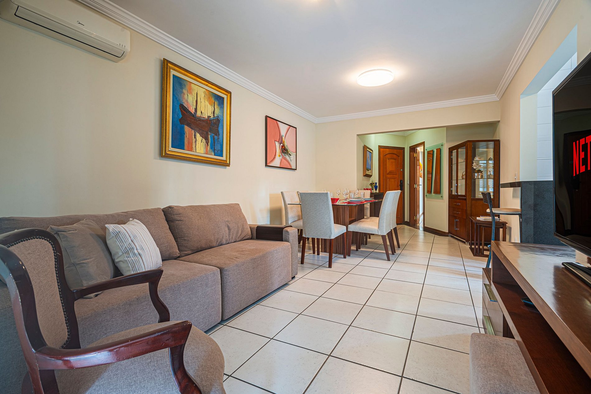Sala de estar aconchegante, perfeita para relaxar após um dia de praia e passeios