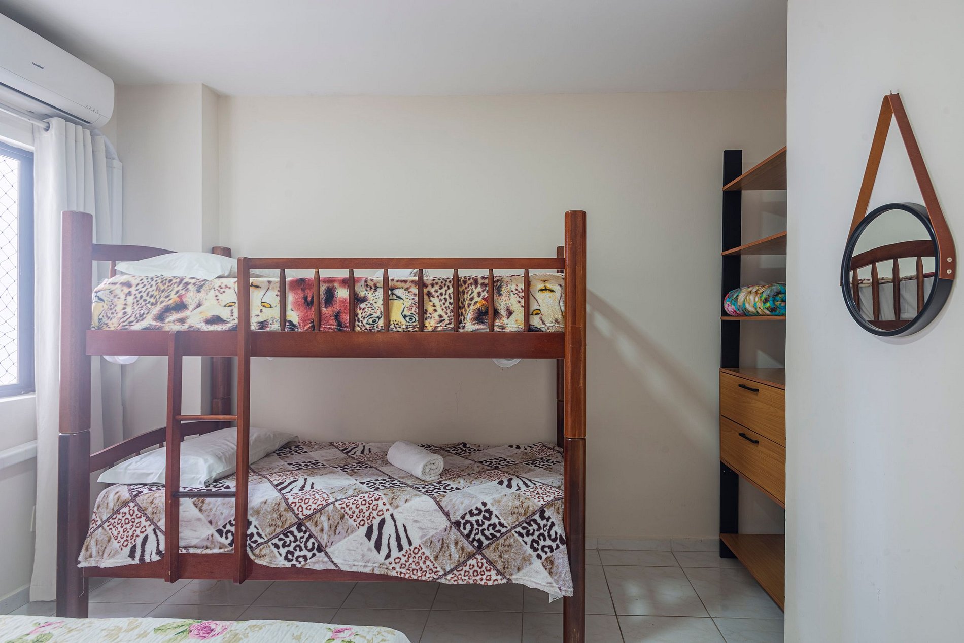 O apartamento conta com uma suíte, um dormitório amplo e um dormitório menor após a cozinha, tendo ao total três camas de casal e uma beliche.