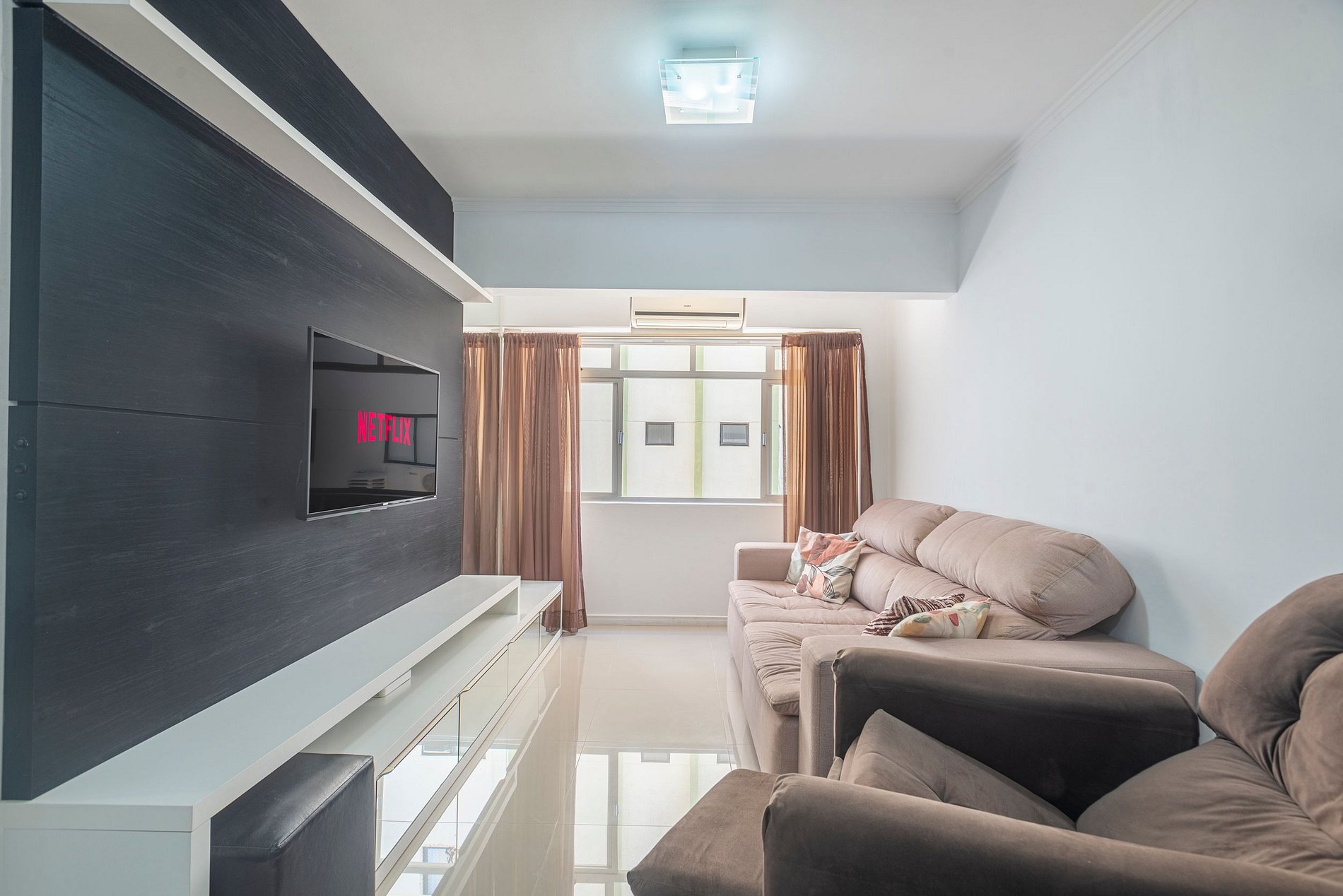 Nosso apartamento é totalmente climatizado, com ar condicionado na sala de estar e nos quartos. Ainda, oferece uma atmosfera aconchegante e acolhedora, garantindo que você se sinta em casa durante toda a sua estadia. O espaço inclui uma sala de estar confortável, perfeita para relaxar após um dia agitado na cidade. Além disso, a cozinha equipada permitirá que você prepare suas refeições favoritas, caso deseje desfrutar de uma experiência gastronômica mais intimista.