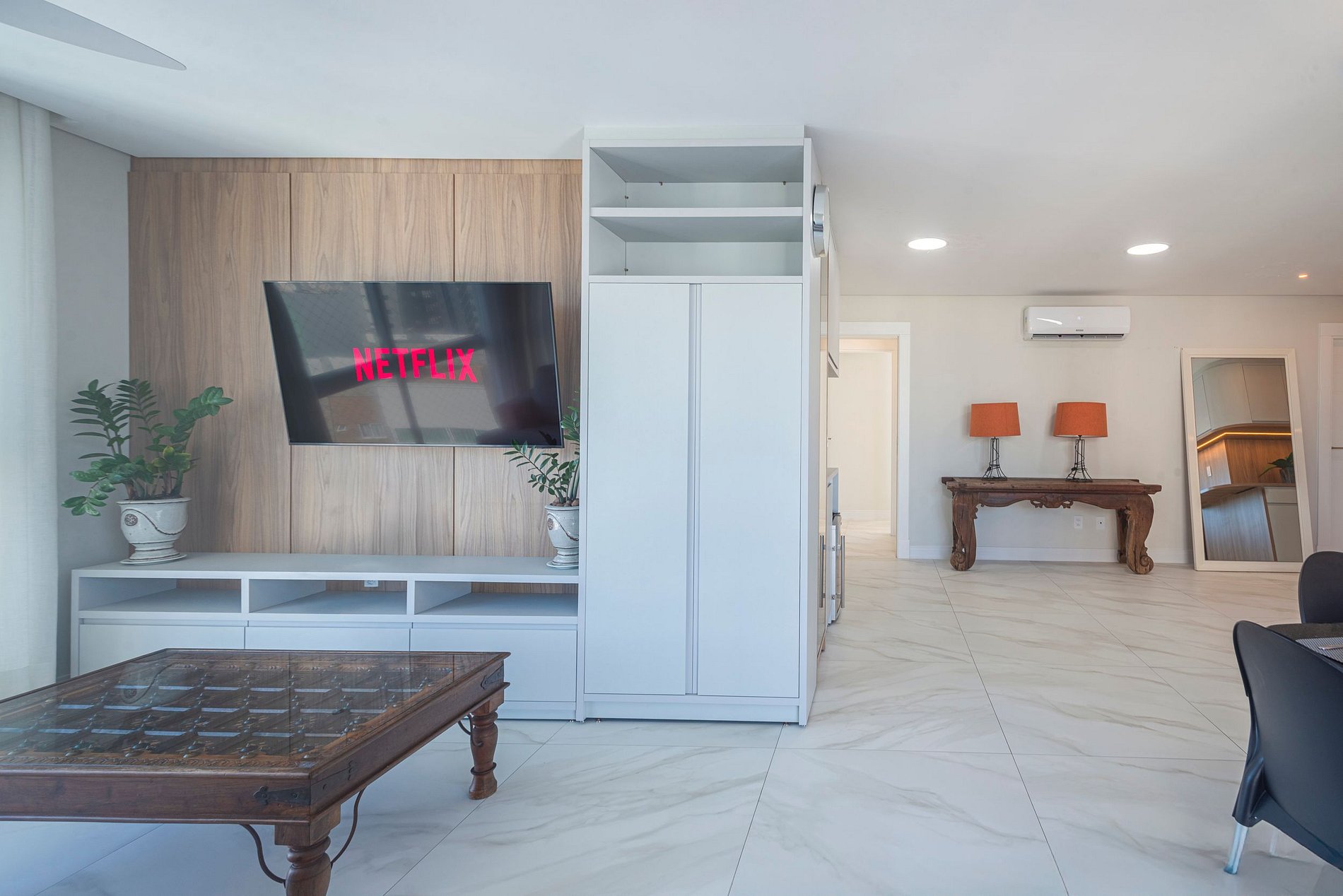 A acomodação conta com ar condicionado nas três suítes e também na sala de estar.