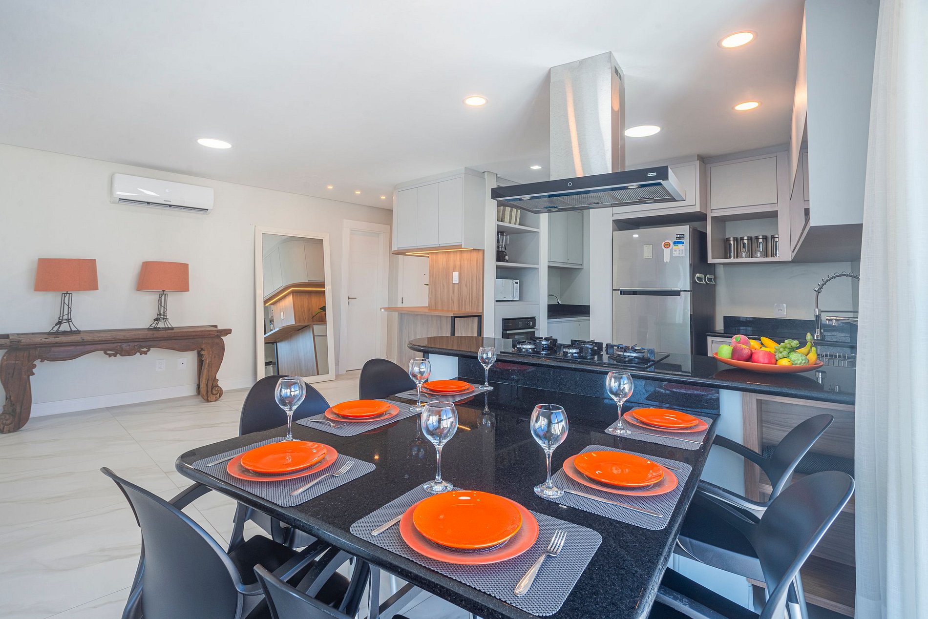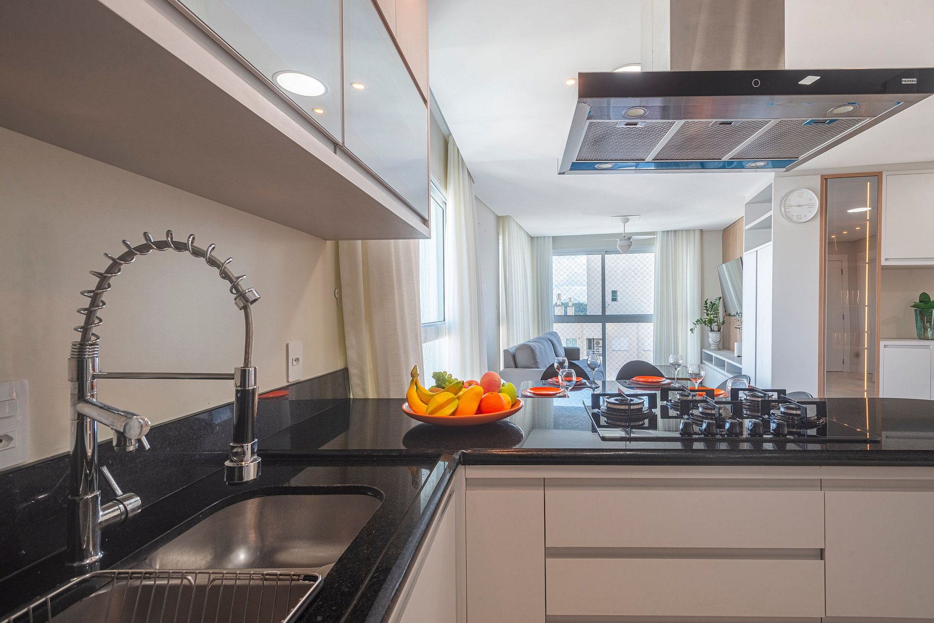 > Cozinha completa integrada à sala de estar climatizada, perfeita para momentos em família ou entre amigos.