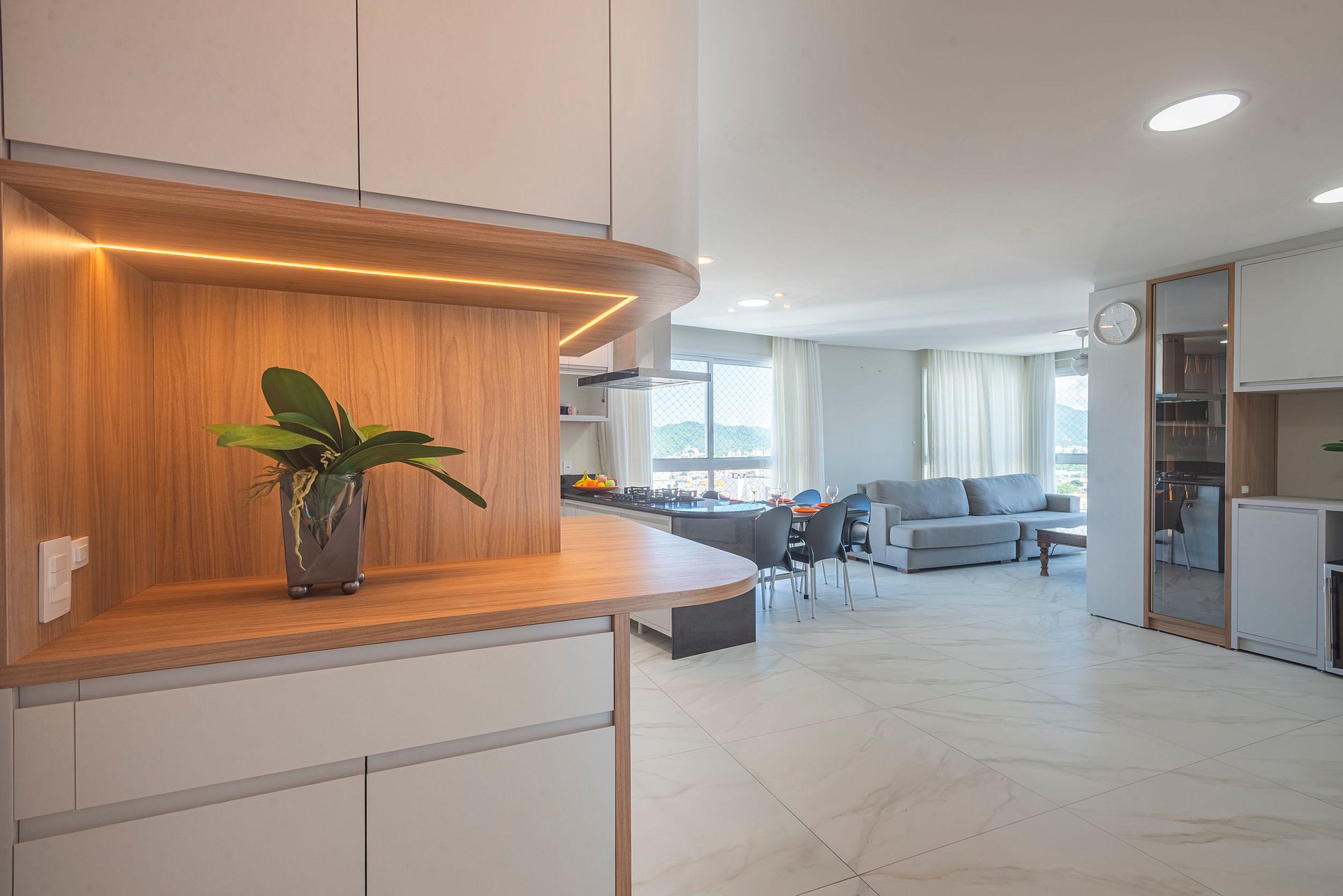 > Cozinha completa integrada à sala de estar climatizada, perfeita para momentos em família ou entre amigos.