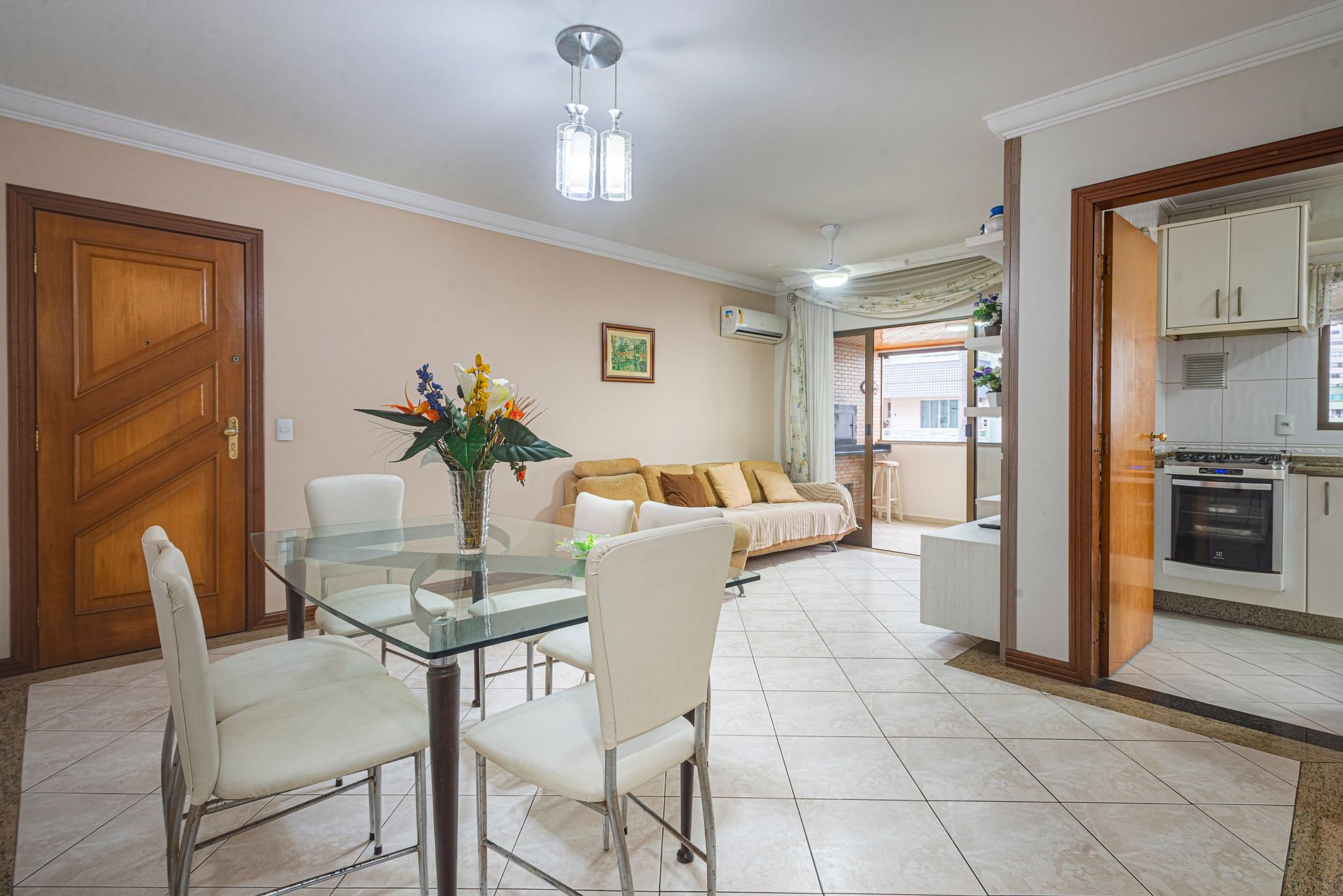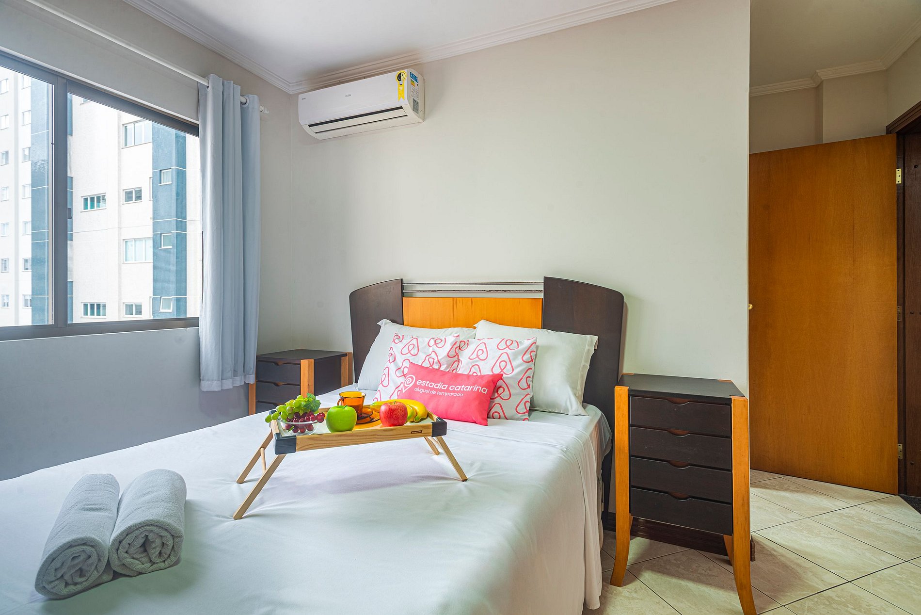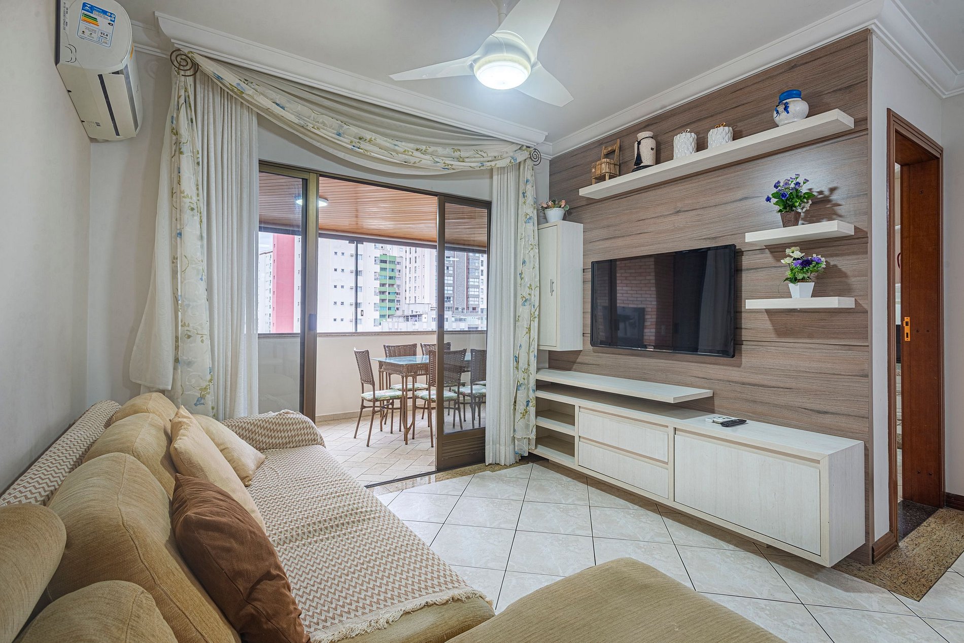 O apartamento oferece ar-condicionado nos três quartos e também na sala de estar, garantindo conforto nos dias quentes.