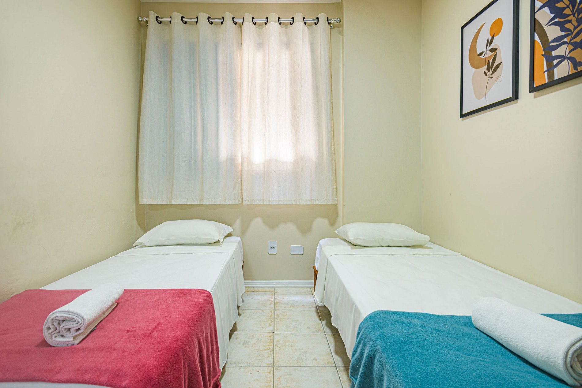 Camas preparadas com roupas de cama limpas e higienizadas, travesseiros e mantas. Jogos de banho completos, com uma toalha para cada hóspede.