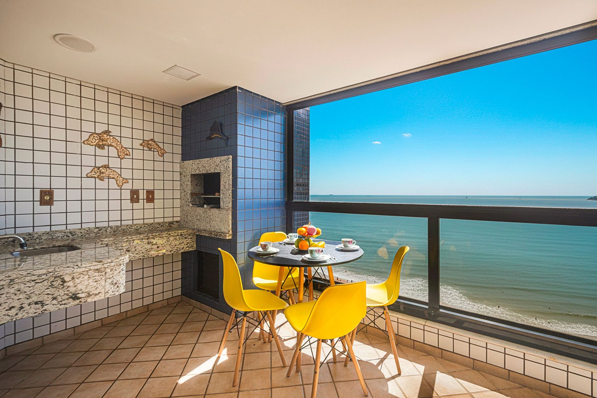 > Sacada espaçosa com churrasqueira a carvão e vista mar incrível.
