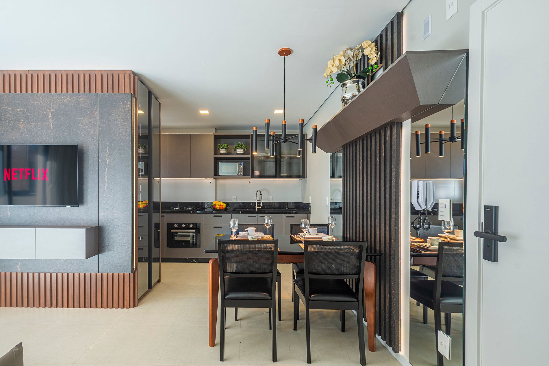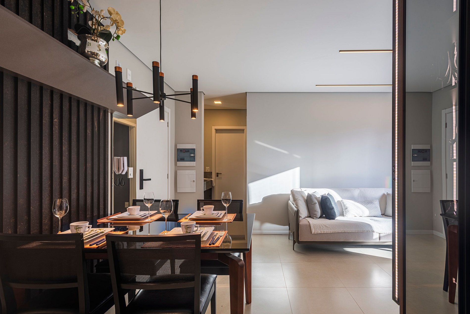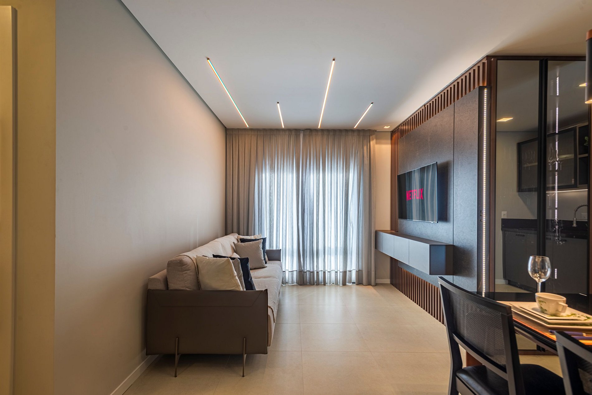 Sala de Estar: A sala de estar é o local perfeito para relaxar. Um sofá confortável e uma TV Smart estão à sua disposição para momentos de descanso e entretenimento.