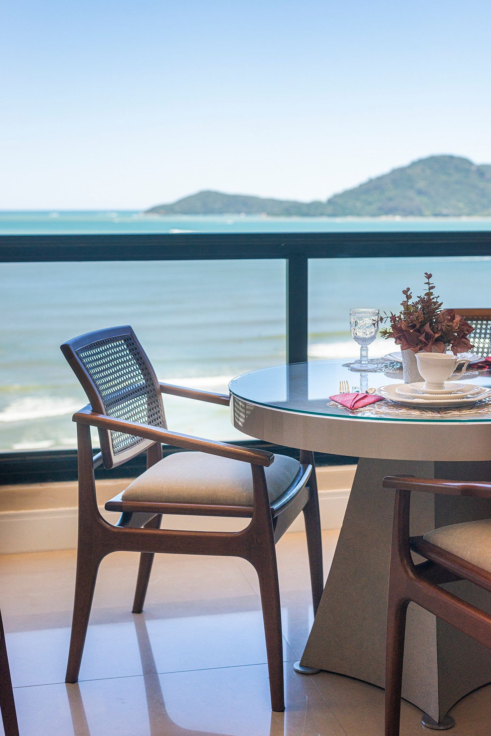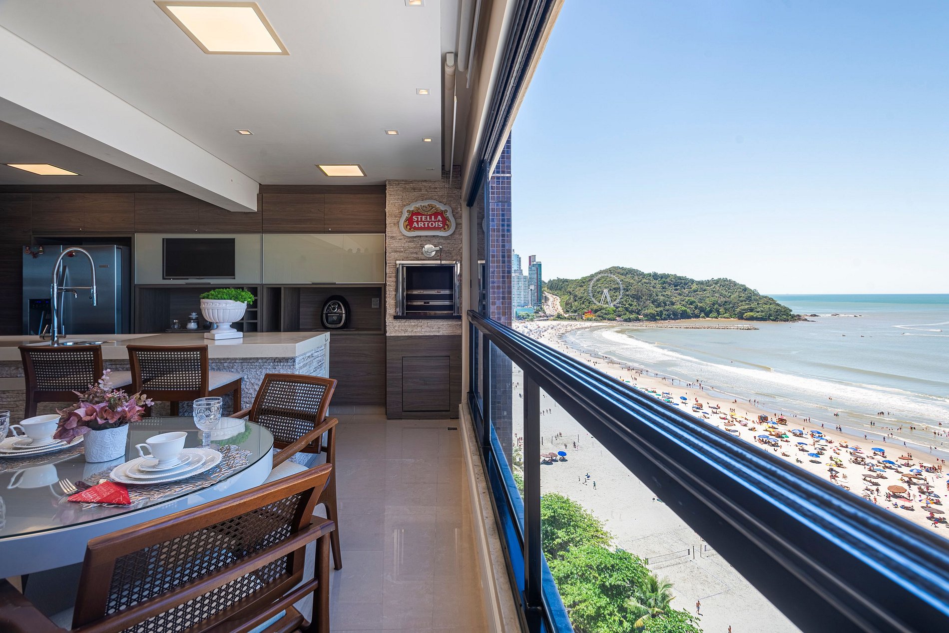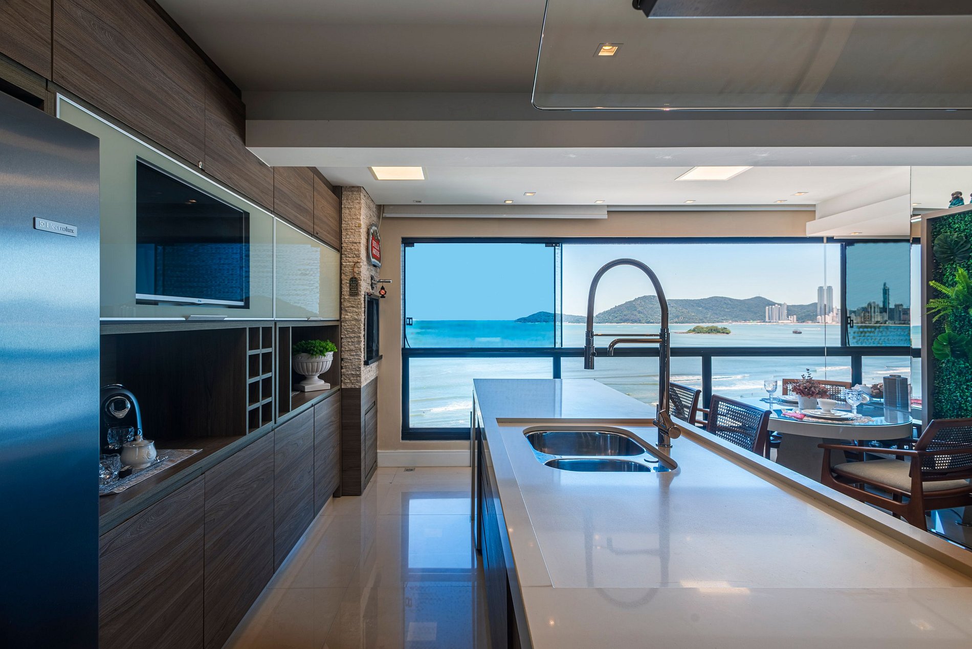 > Sacada gourmet com churrasqueira a carvão para grelhados com uma incrível vista para o mar;