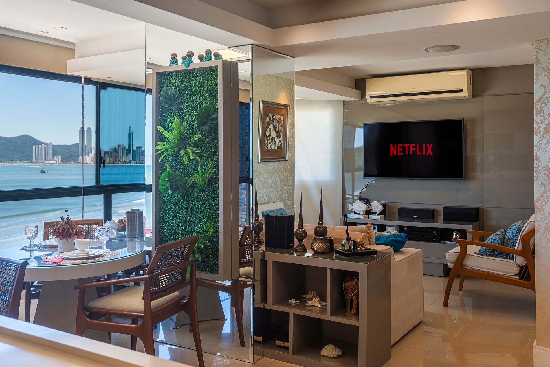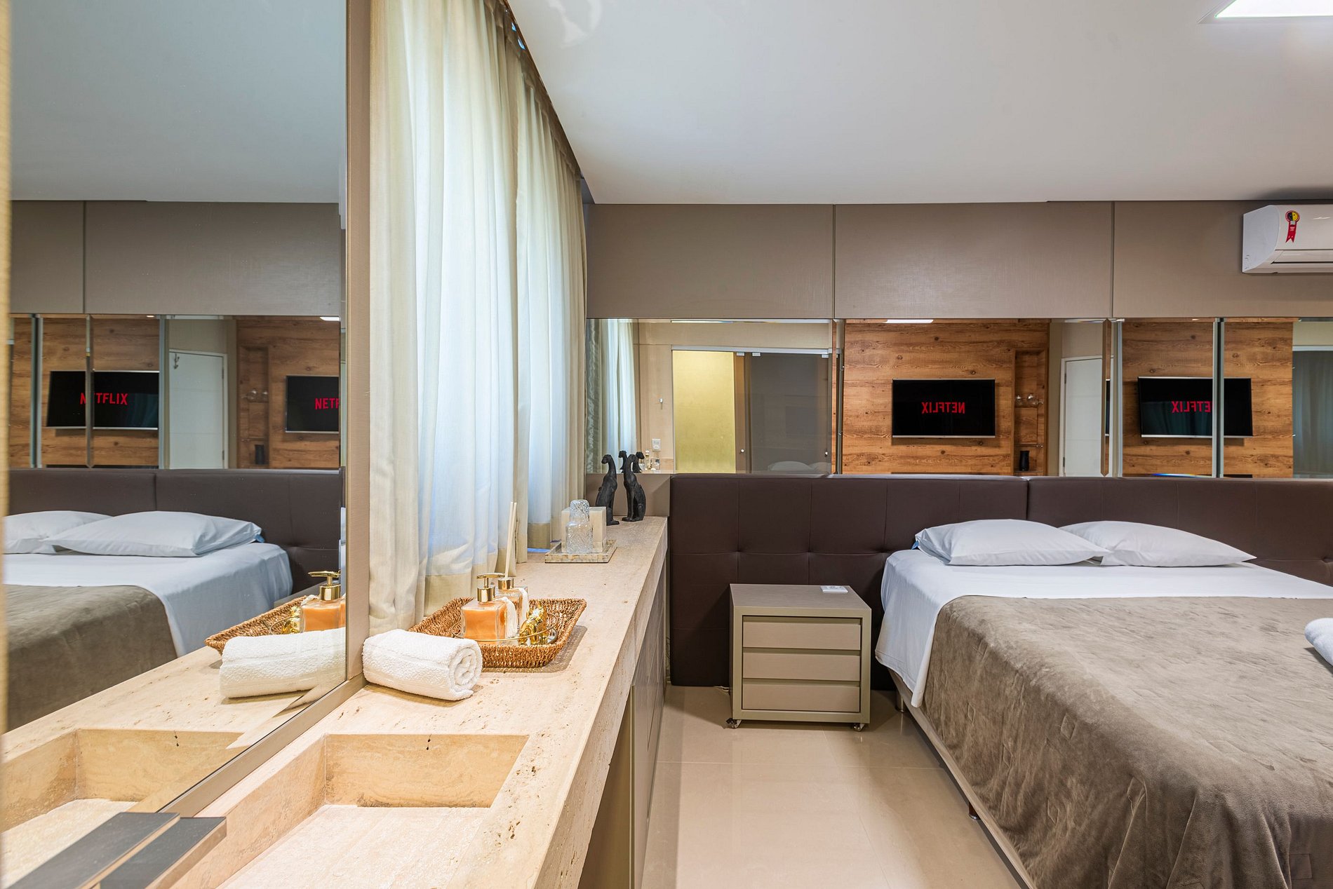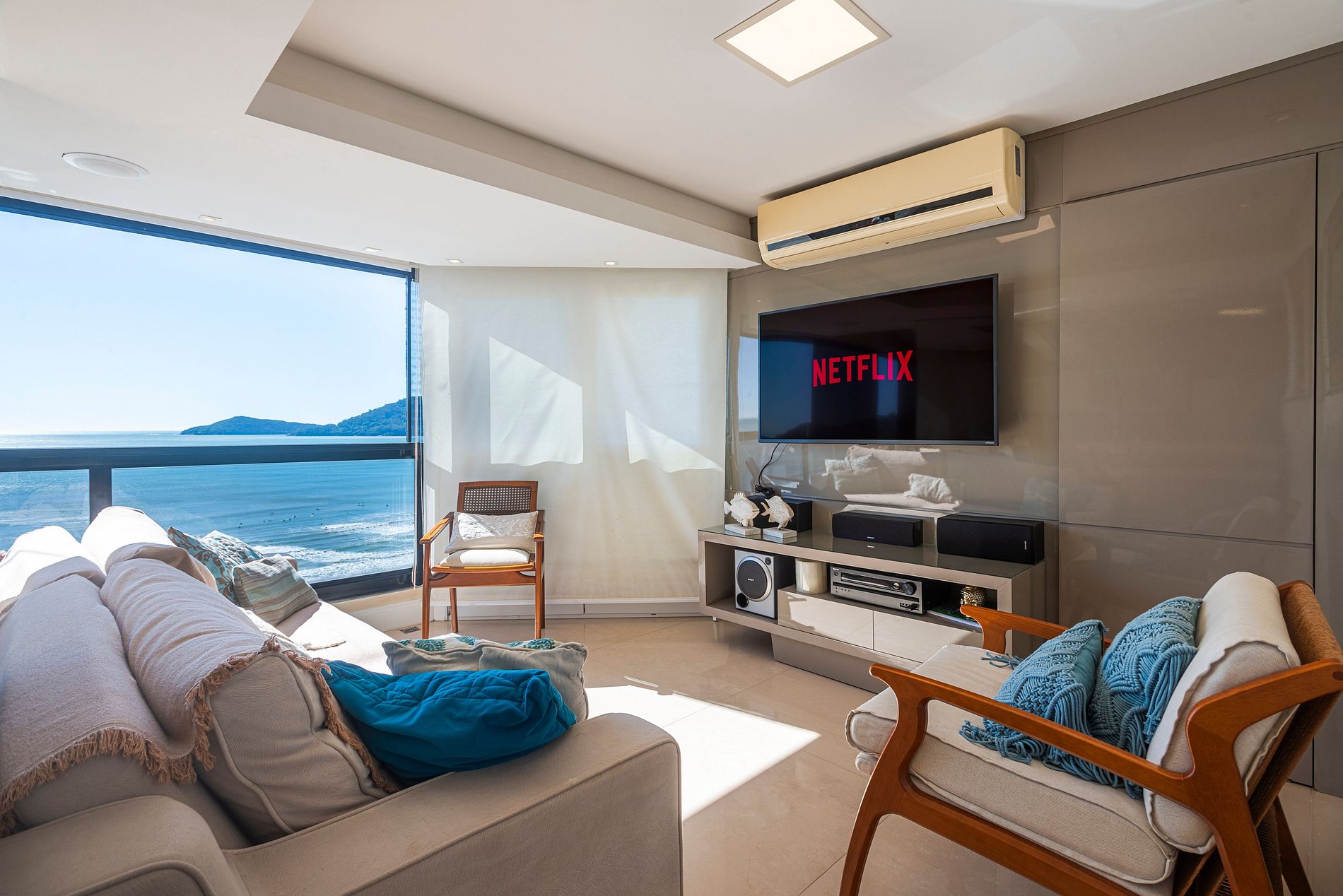 A acomodação conta com ar condicionado nos quatro quartos e também na sala de estar.
