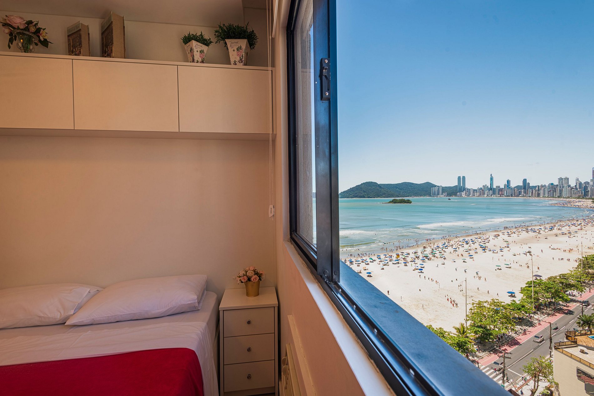 Apartamento em condomínio na Avenida Atlântica, com vista panorâmica para o mar do alto do 14º andar.