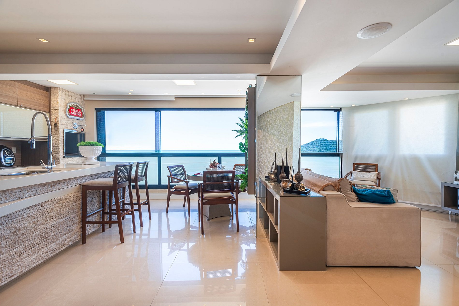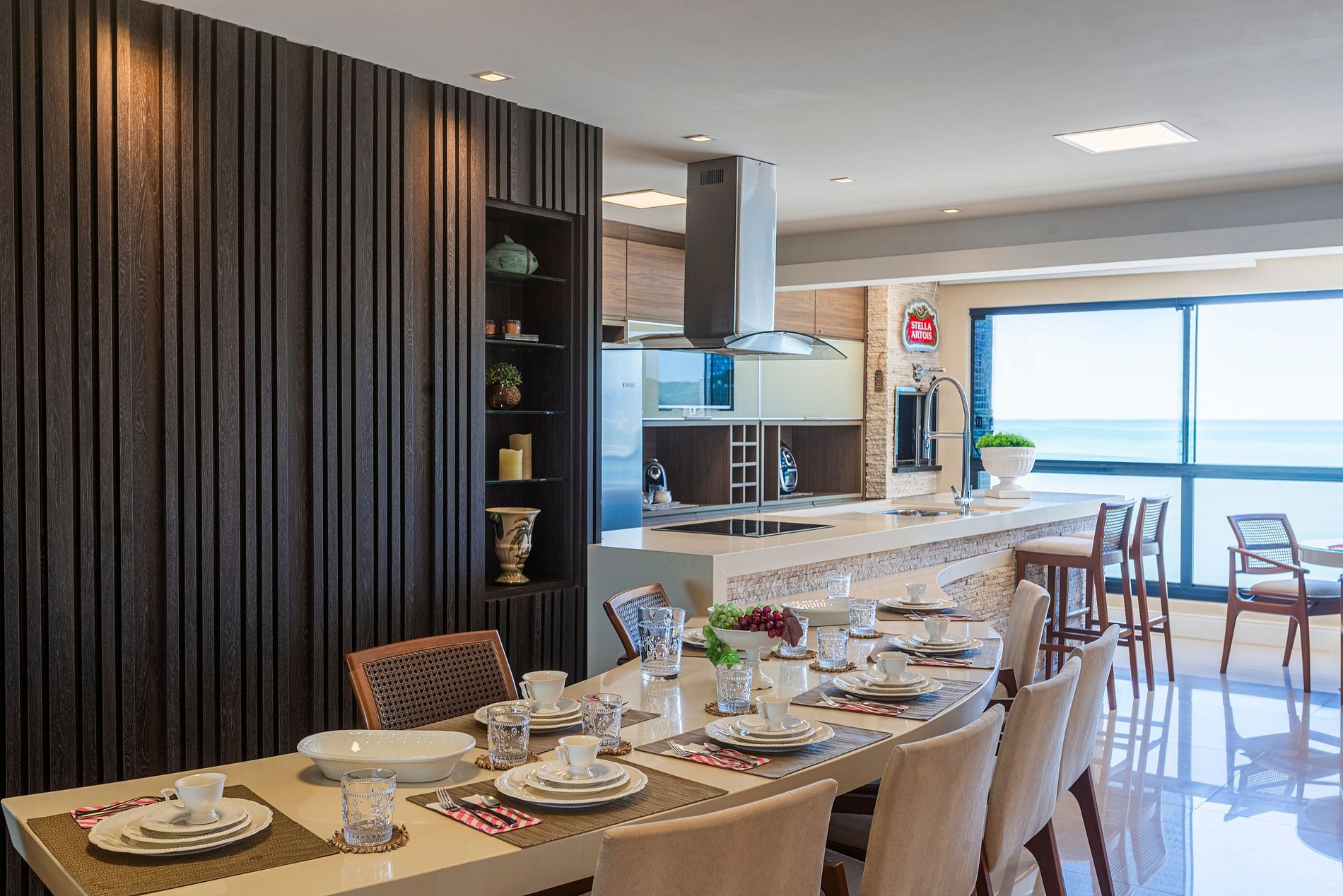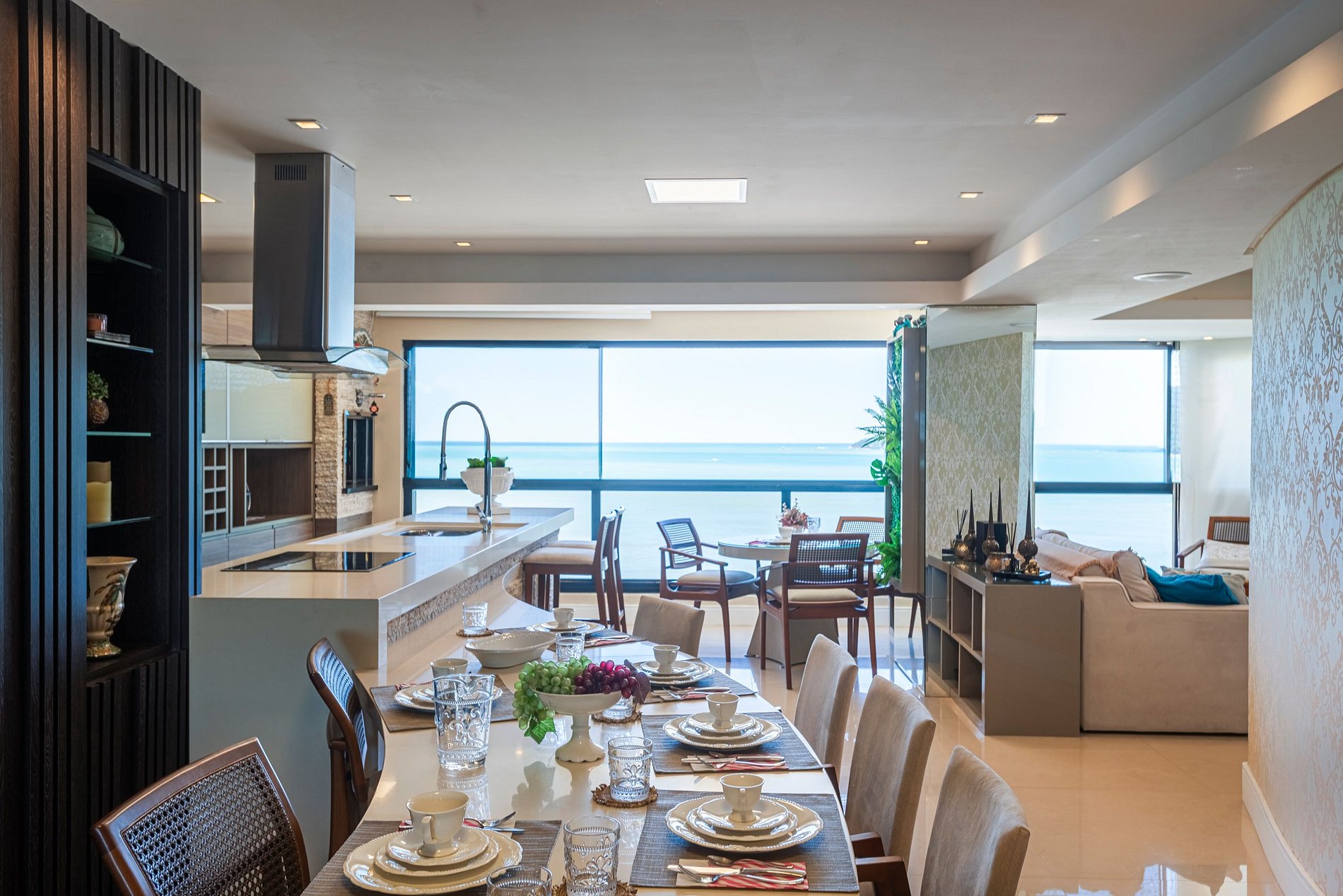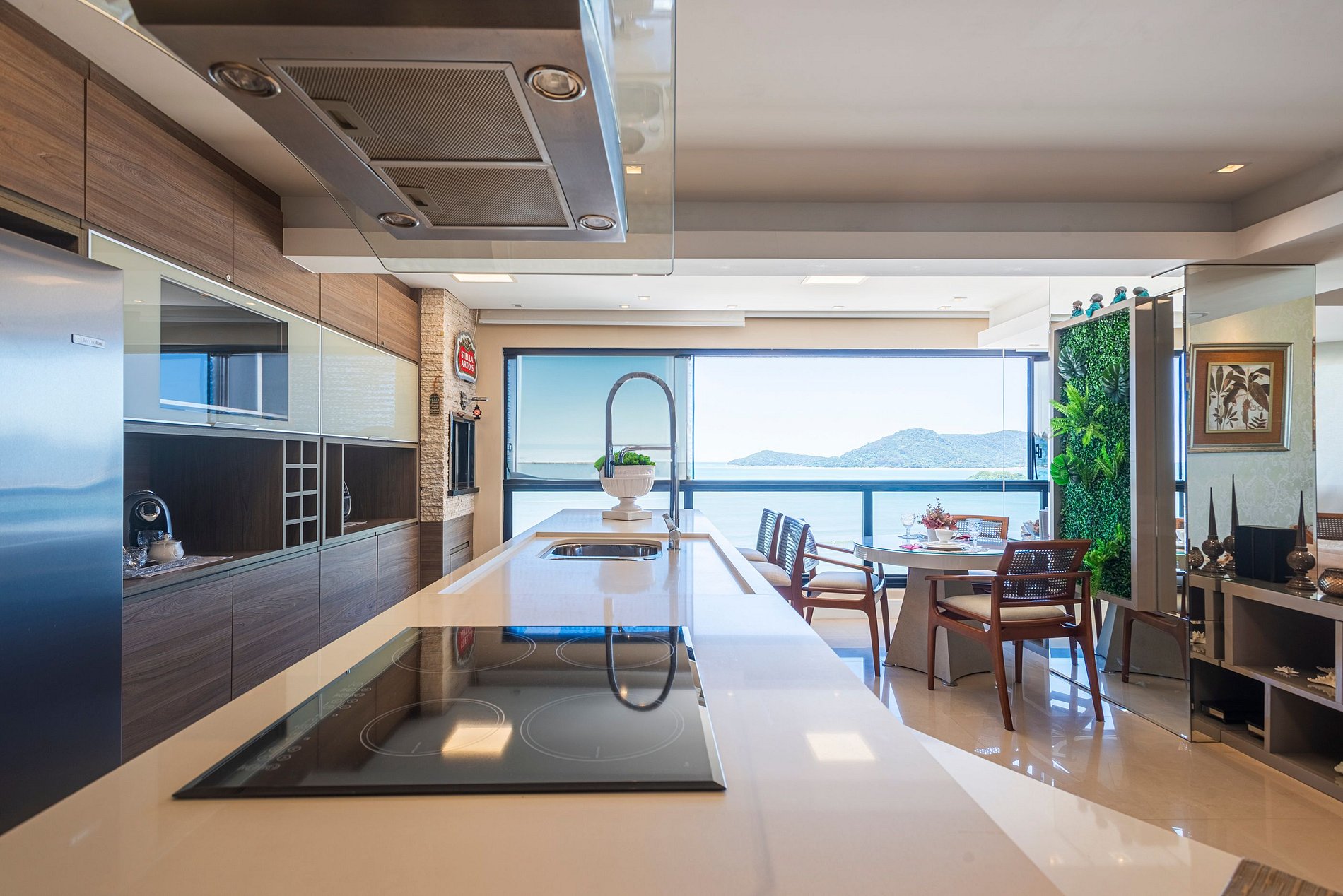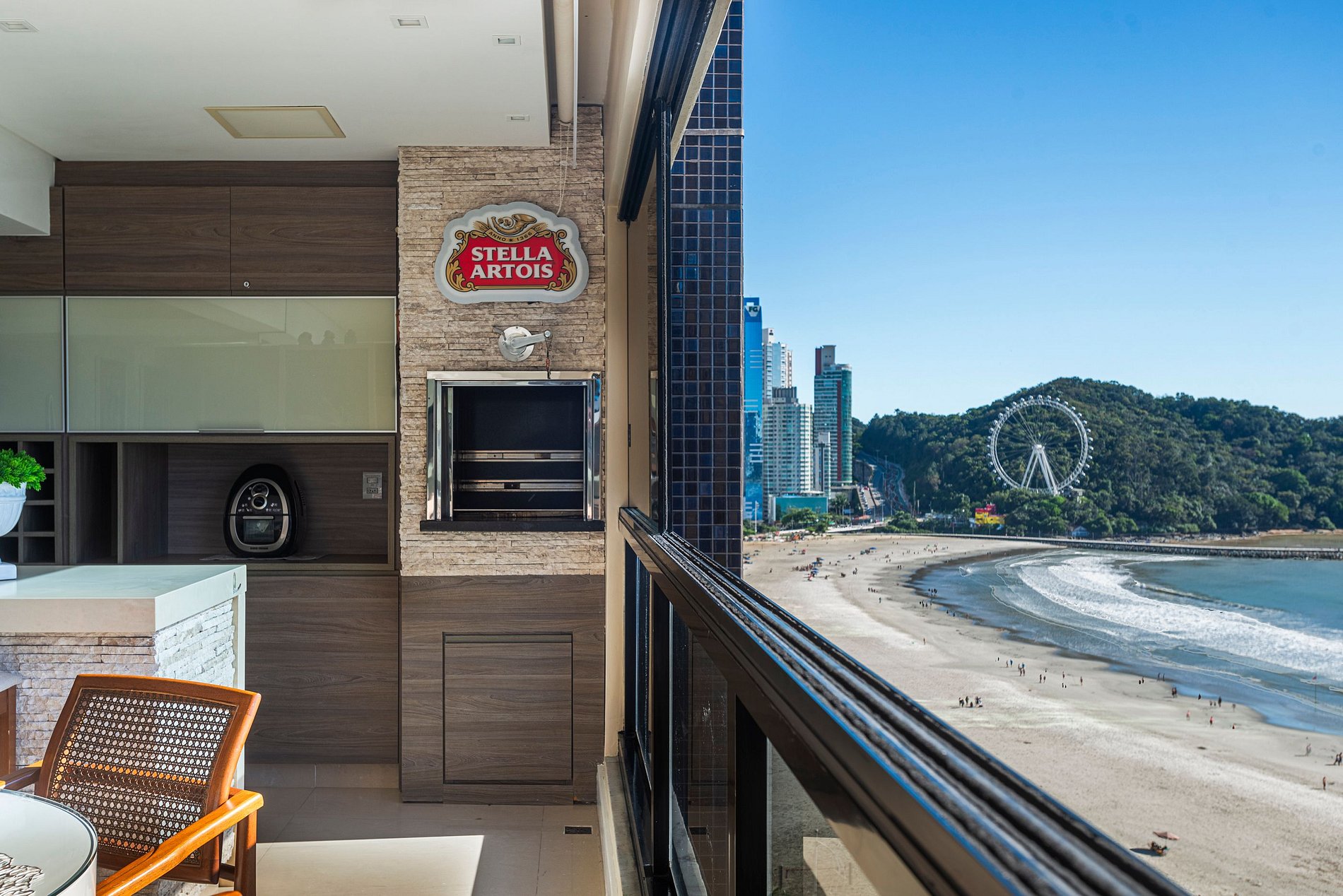 > Sacada gourmet com churrasqueira a carvão para grelhados com uma incrível vista para o mar;
