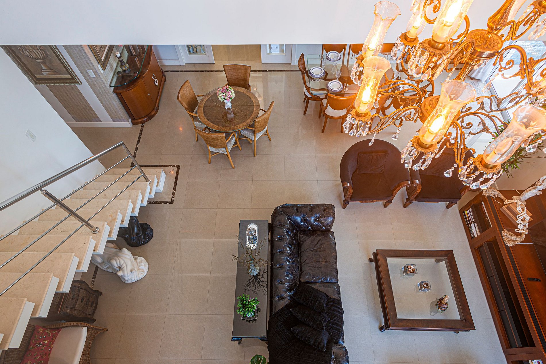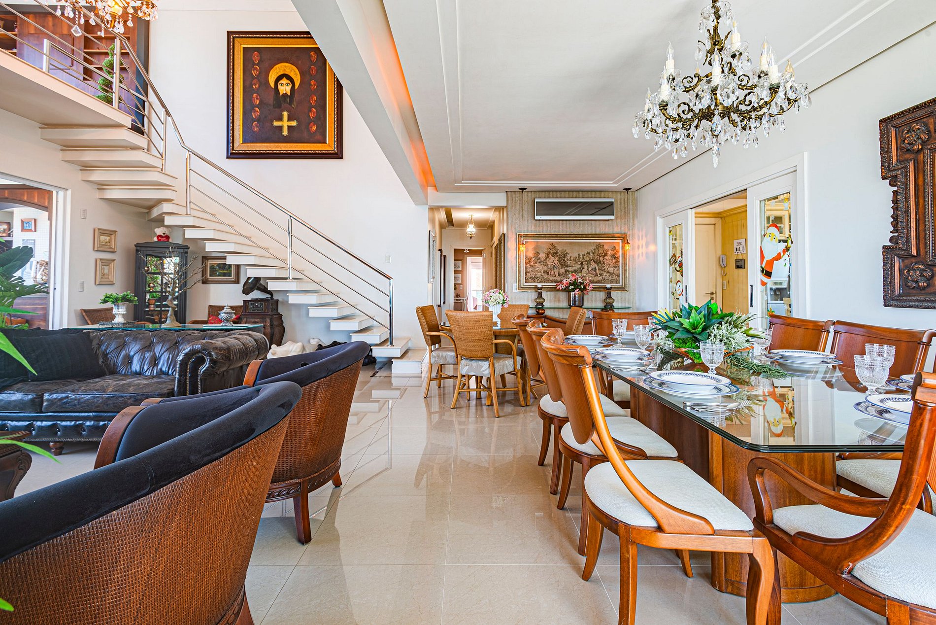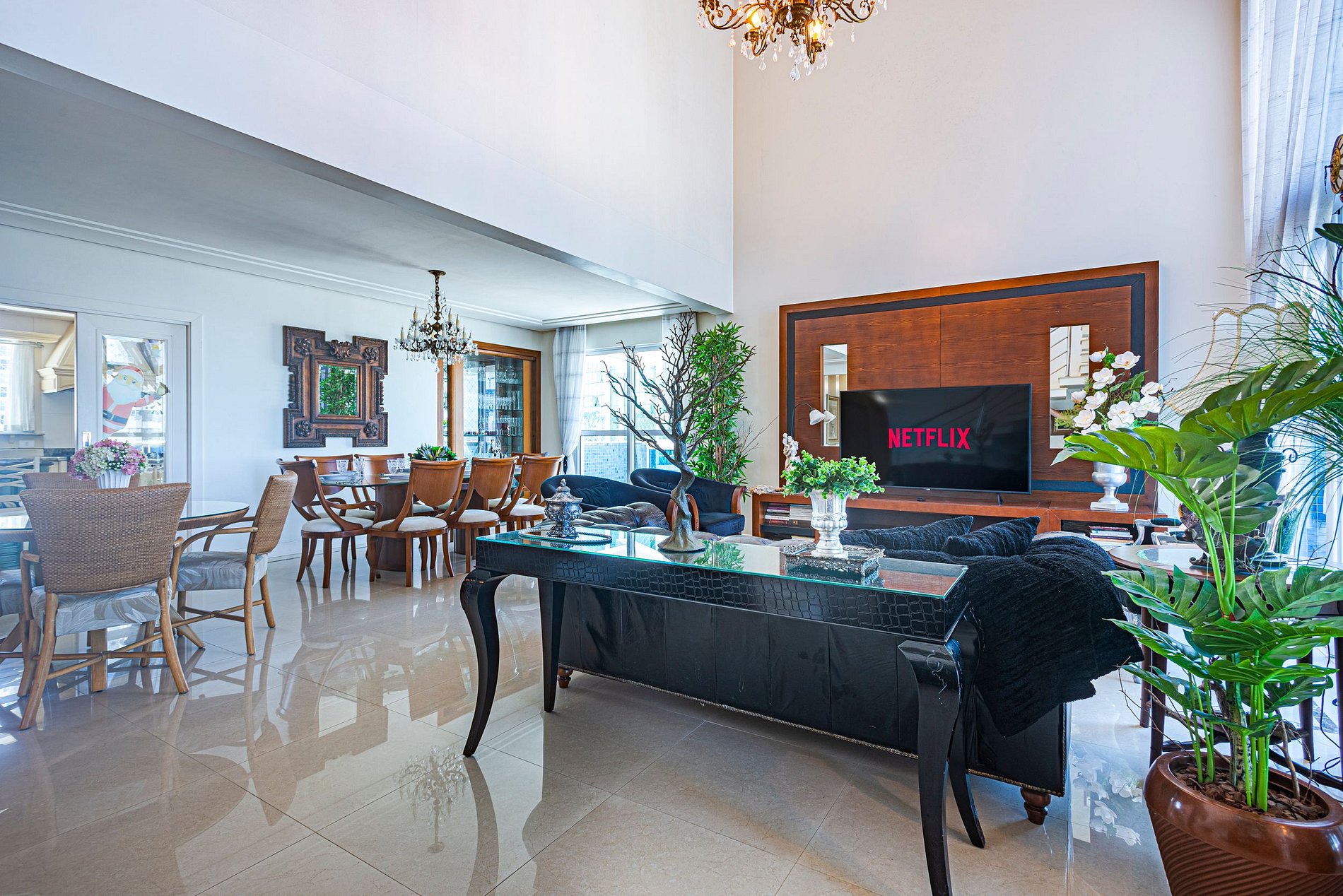 • Ampla sala com pé-direito duplo, ambiente cheio de luz e integração entre estar e jantar.