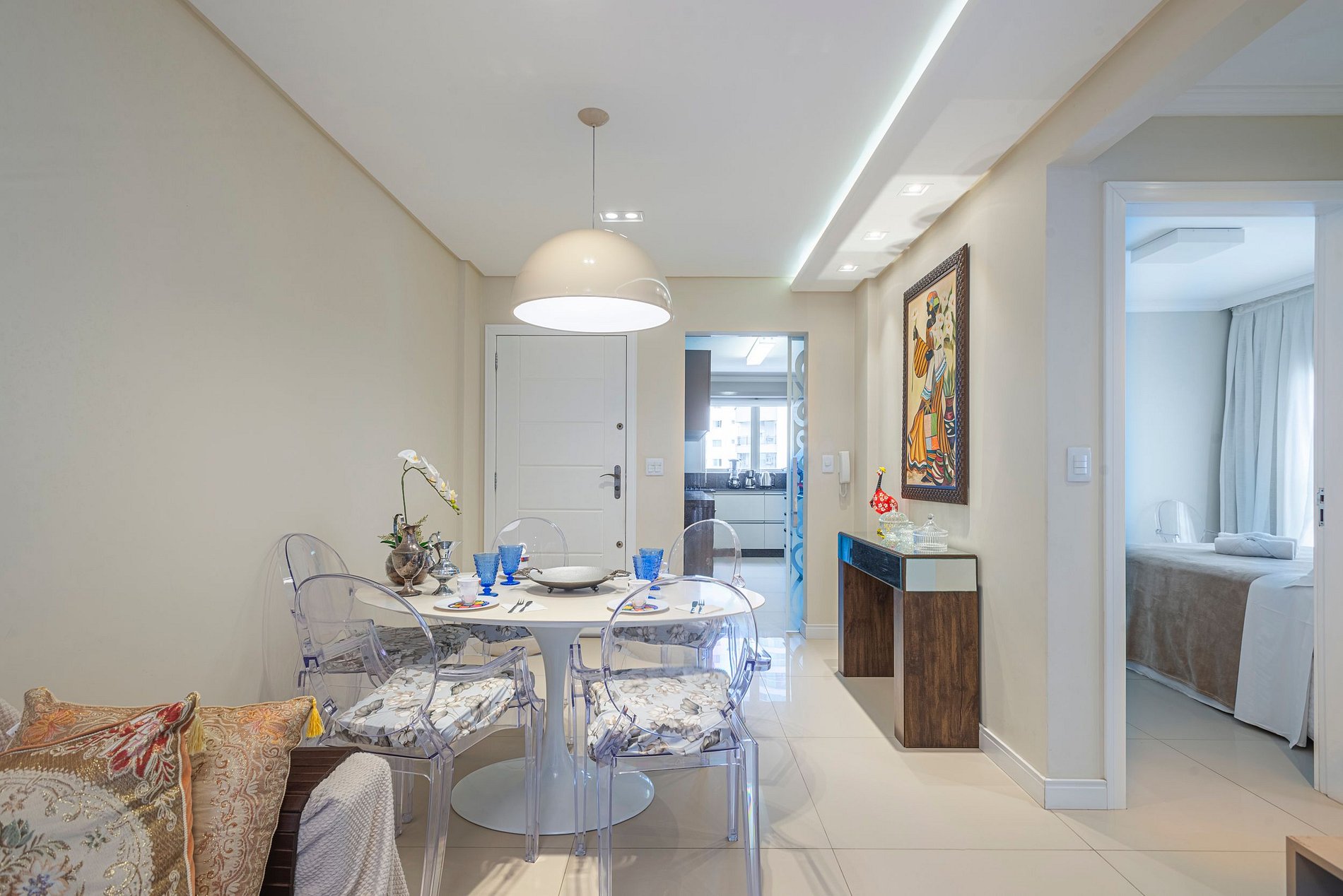 Apartamento totalmente mobiliado e decorado. Tratado com muito carinho e disponível para receber visitantes com um espaço aconchegante, espaçoso e confortável. Conta com 2 quartos, sendo 1 suíte, ambos com cama de casal e ar condicionado.