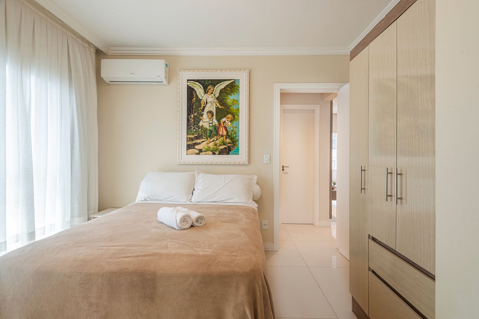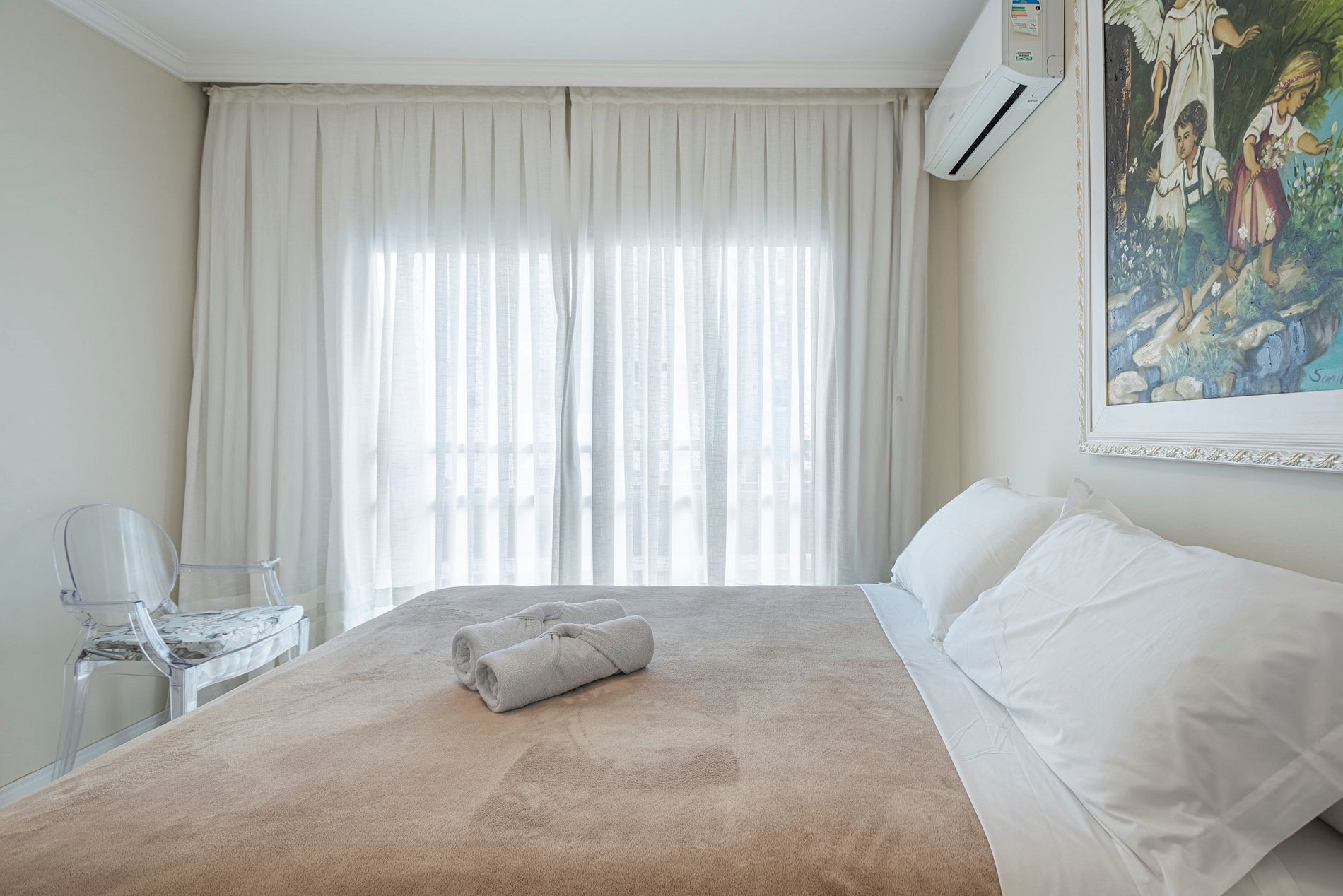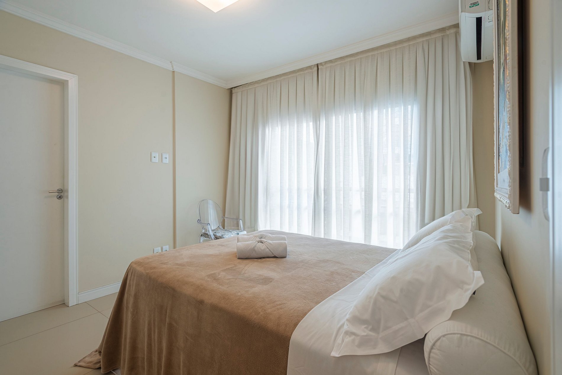 Apartamento totalmente mobiliado e decorado. Tratado com muito carinho e disponível para receber visitantes com um espaço aconchegante, espaçoso e confortável. Conta com 2 quartos, sendo 1 suíte, ambos com cama de casal e ar condicionado.