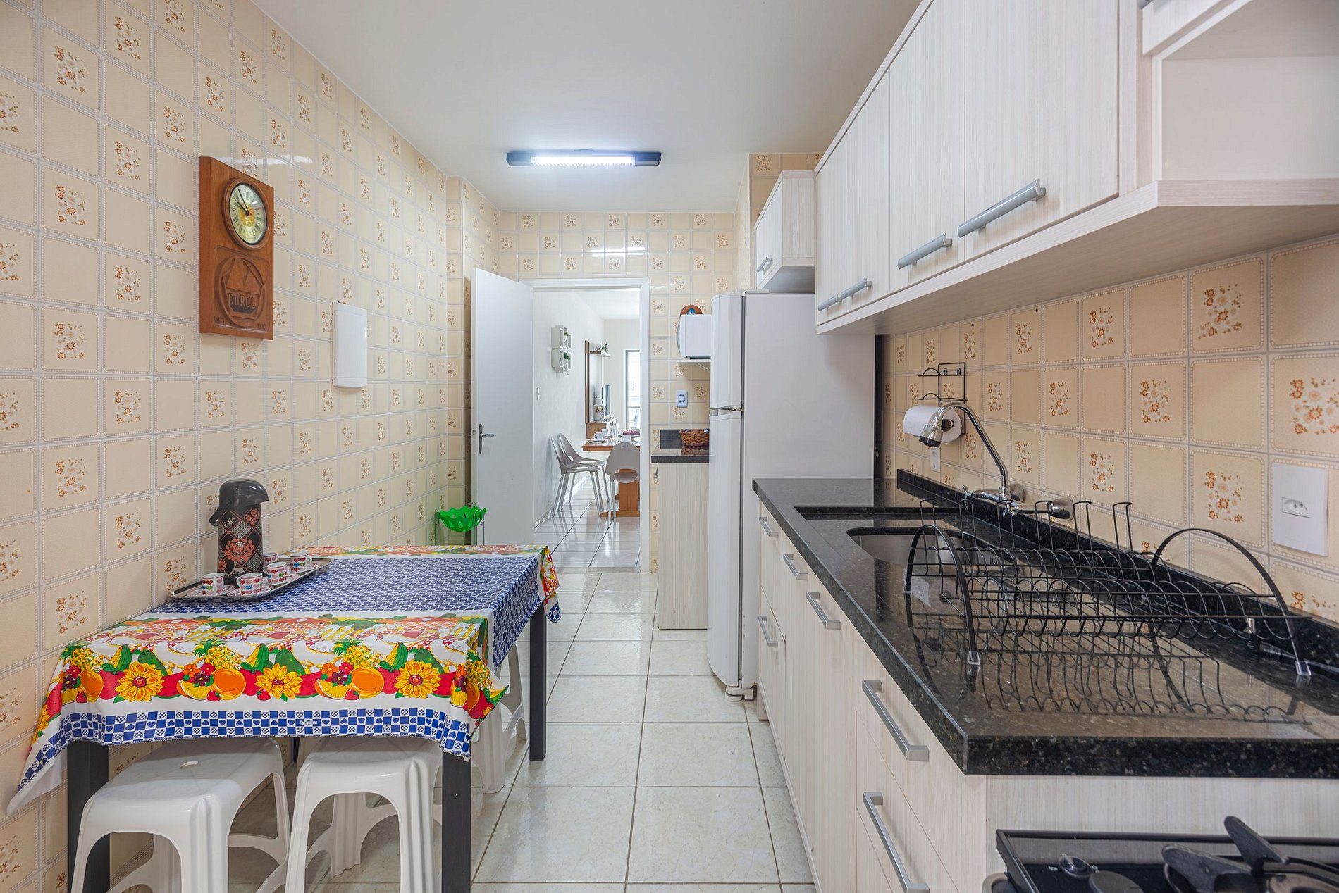 O apartamento conta com uma suíte, um dormitório amplo e um dormitório menor após a cozinha, tendo ao total três camas de casal e uma beliche.