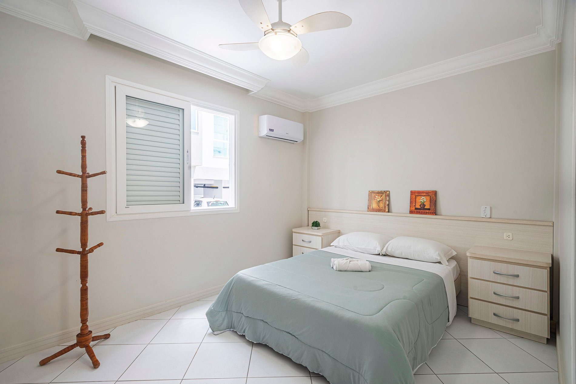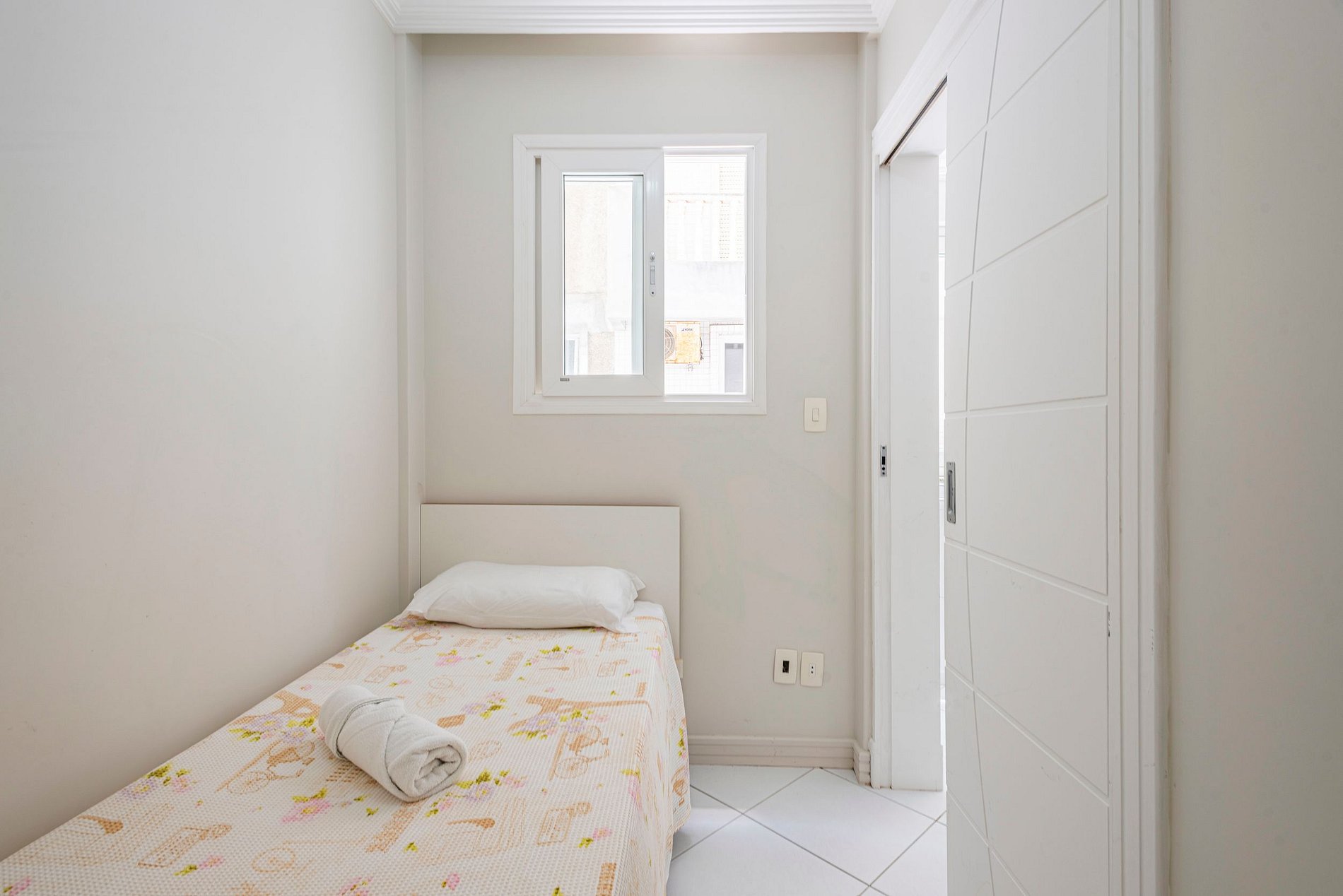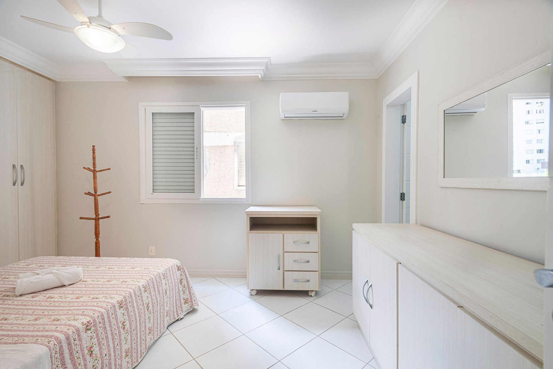 O apartamento conta com uma suíte com ar condicionado, dois dormitórios amplos com e uma suíte menor após a cozinha sem ar condicionado e blackout, tendo ao total três camas de casal, uma cama de solteiro e dois colchões extras.