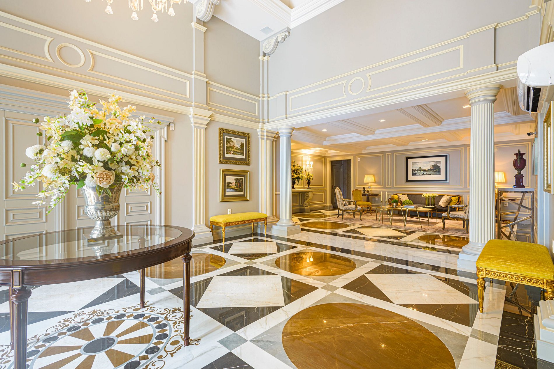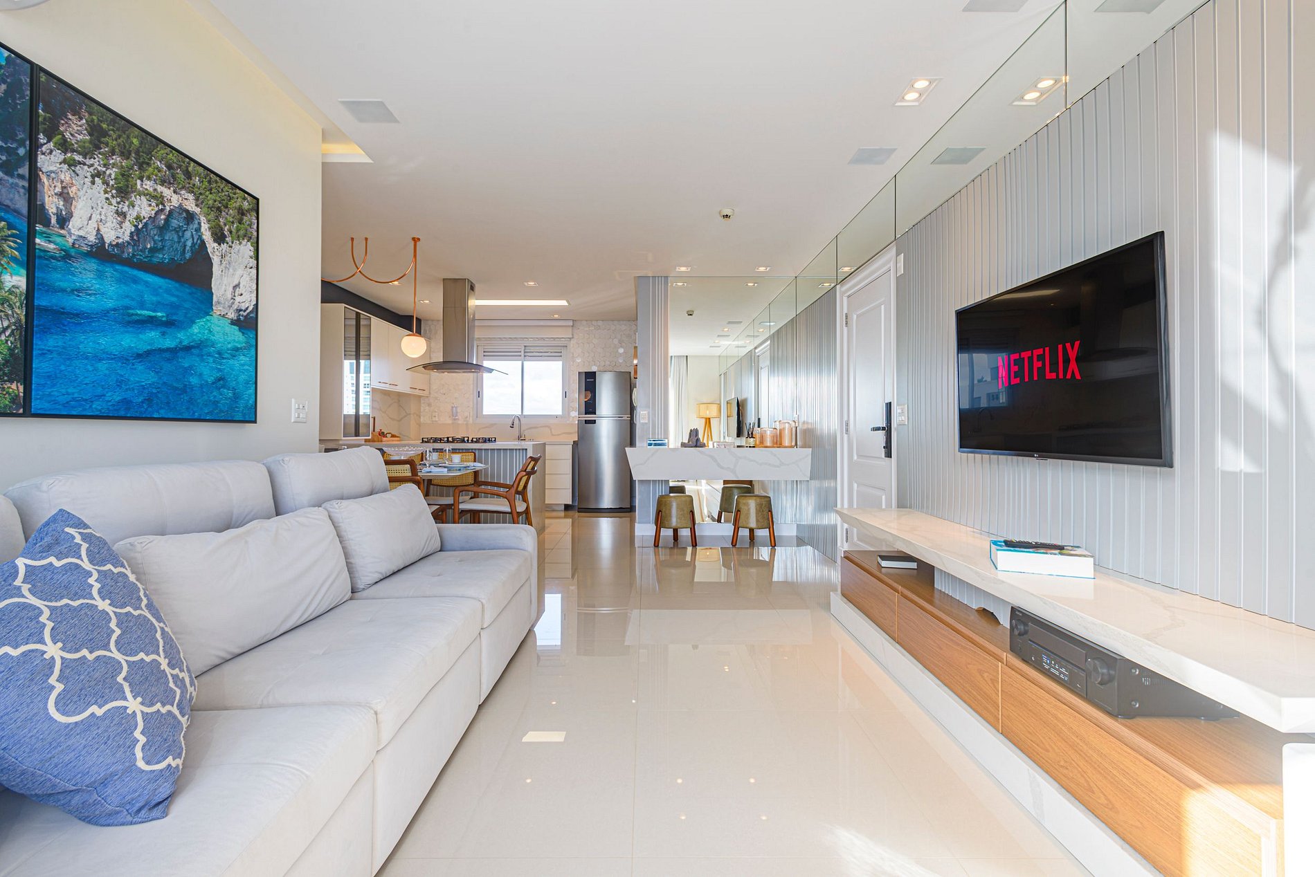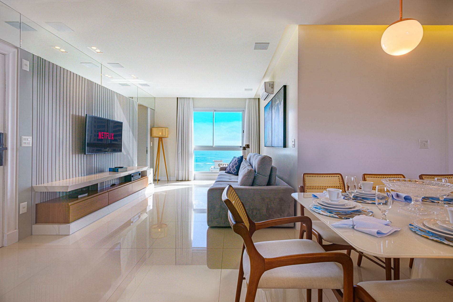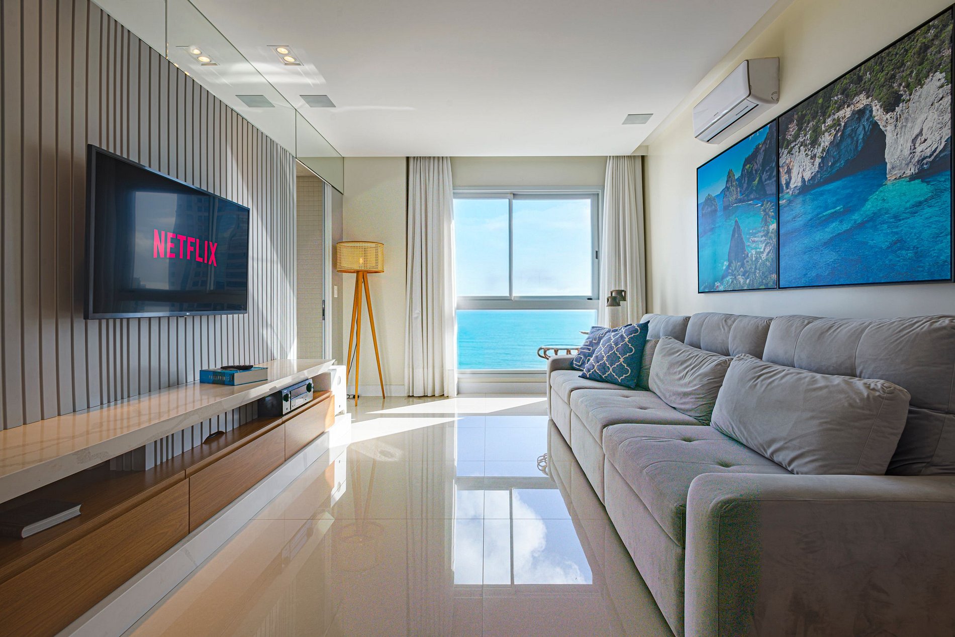 > Sala de estar ampla e climatizada, com Smart TV, perfeita para momentos de lazer ou descanso em família.