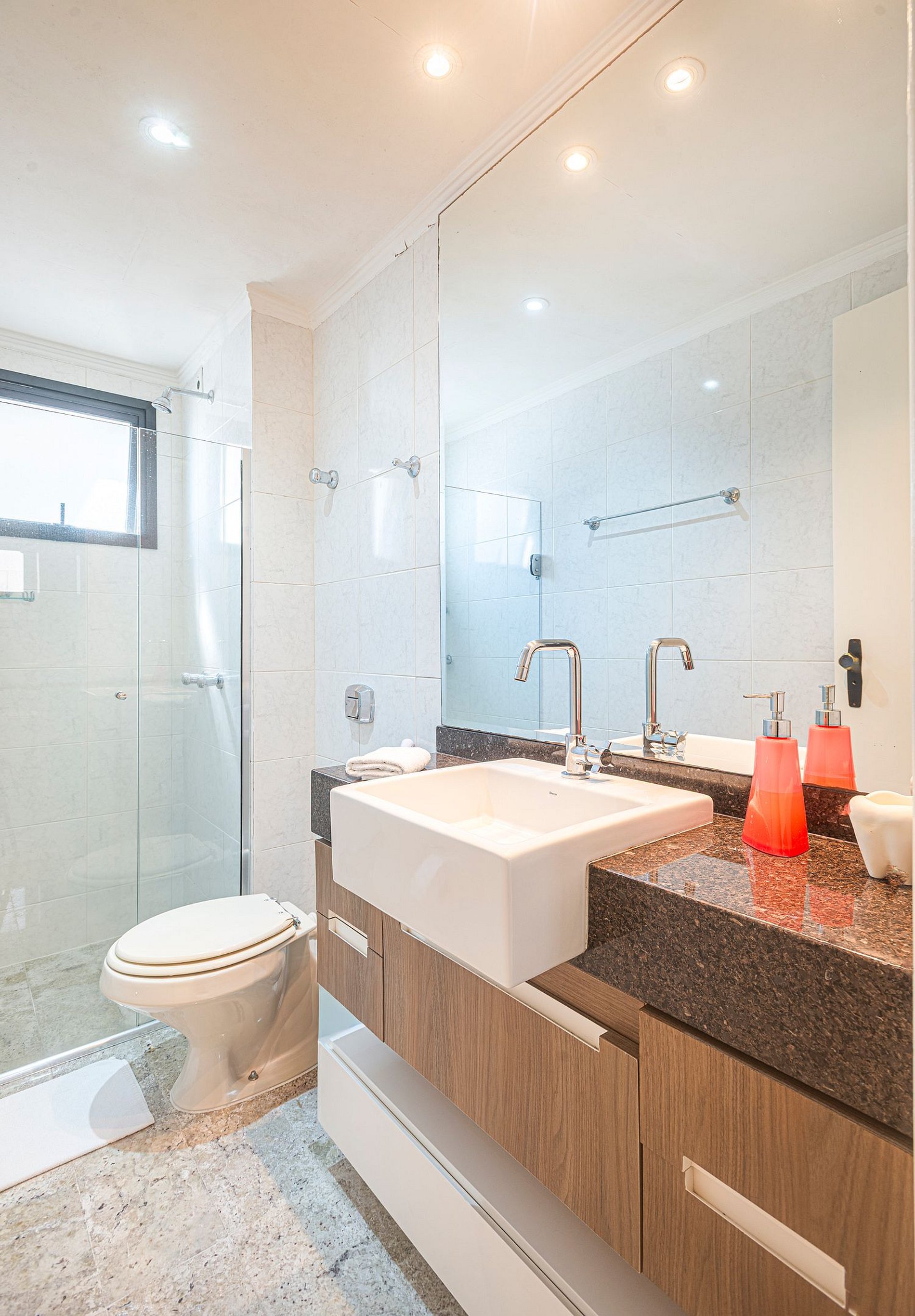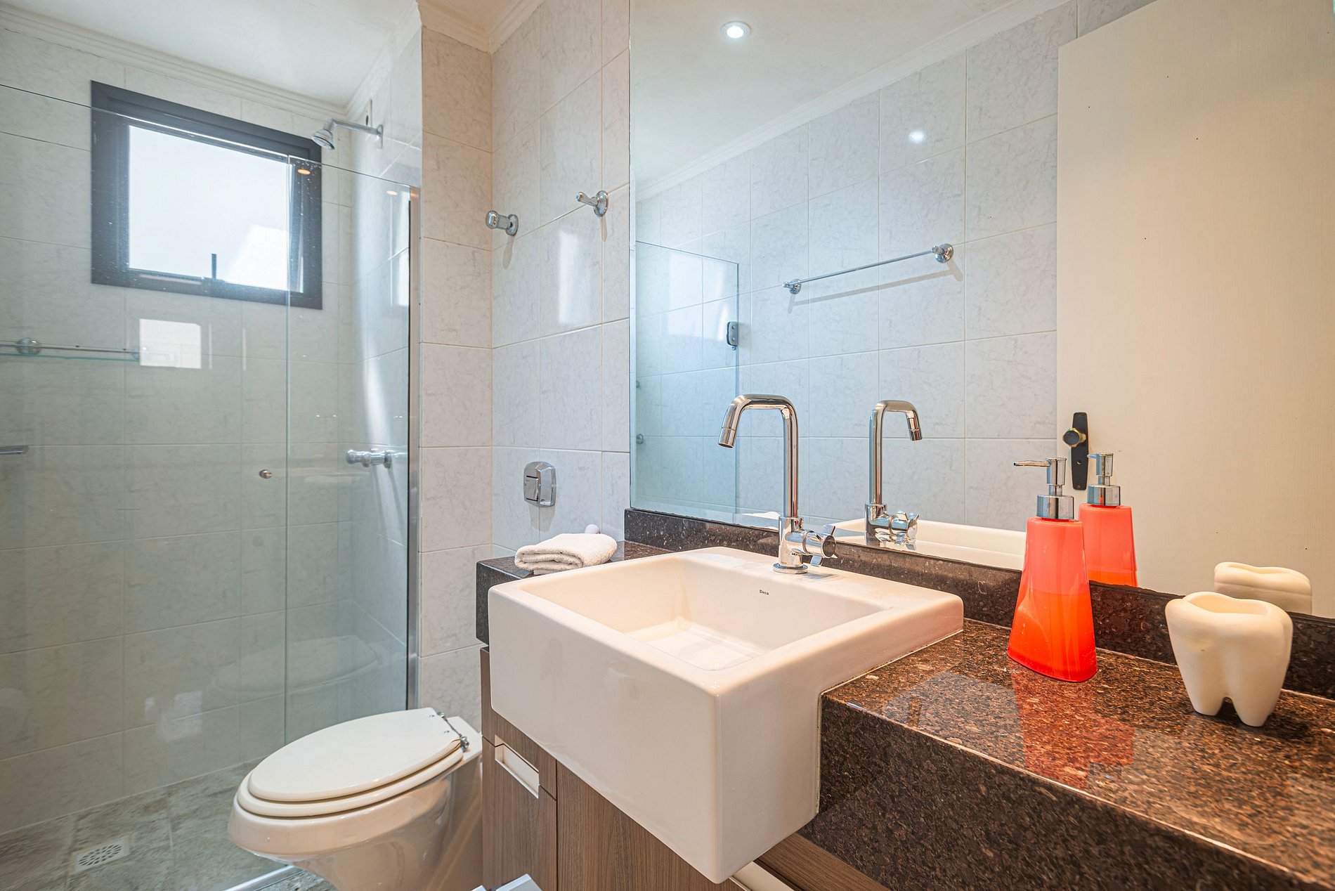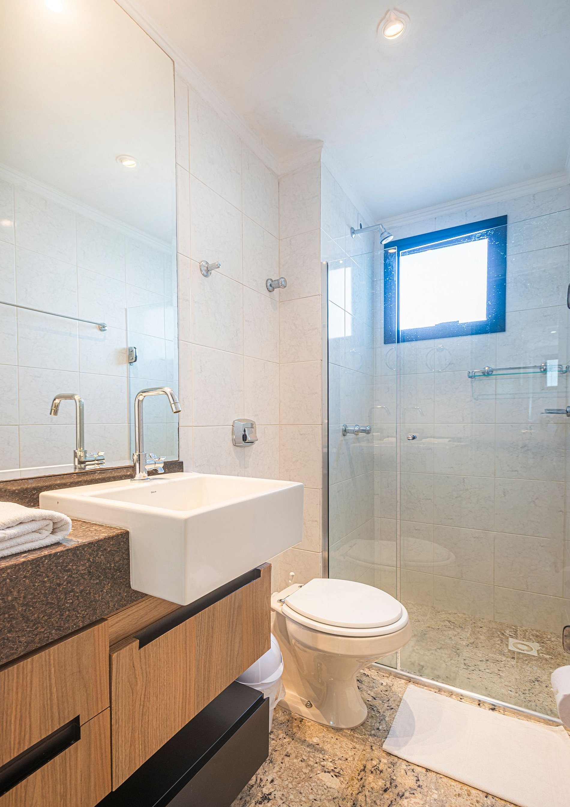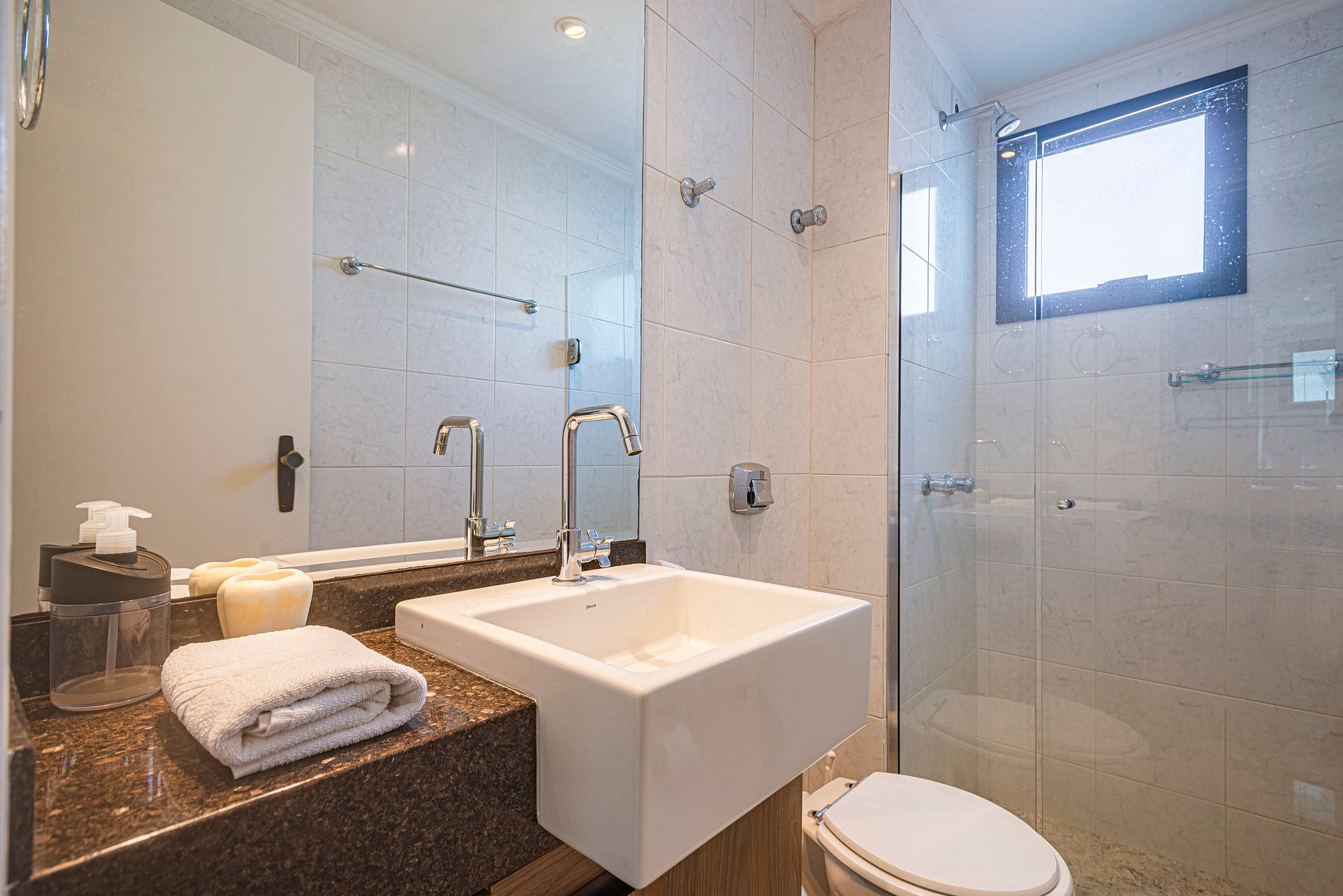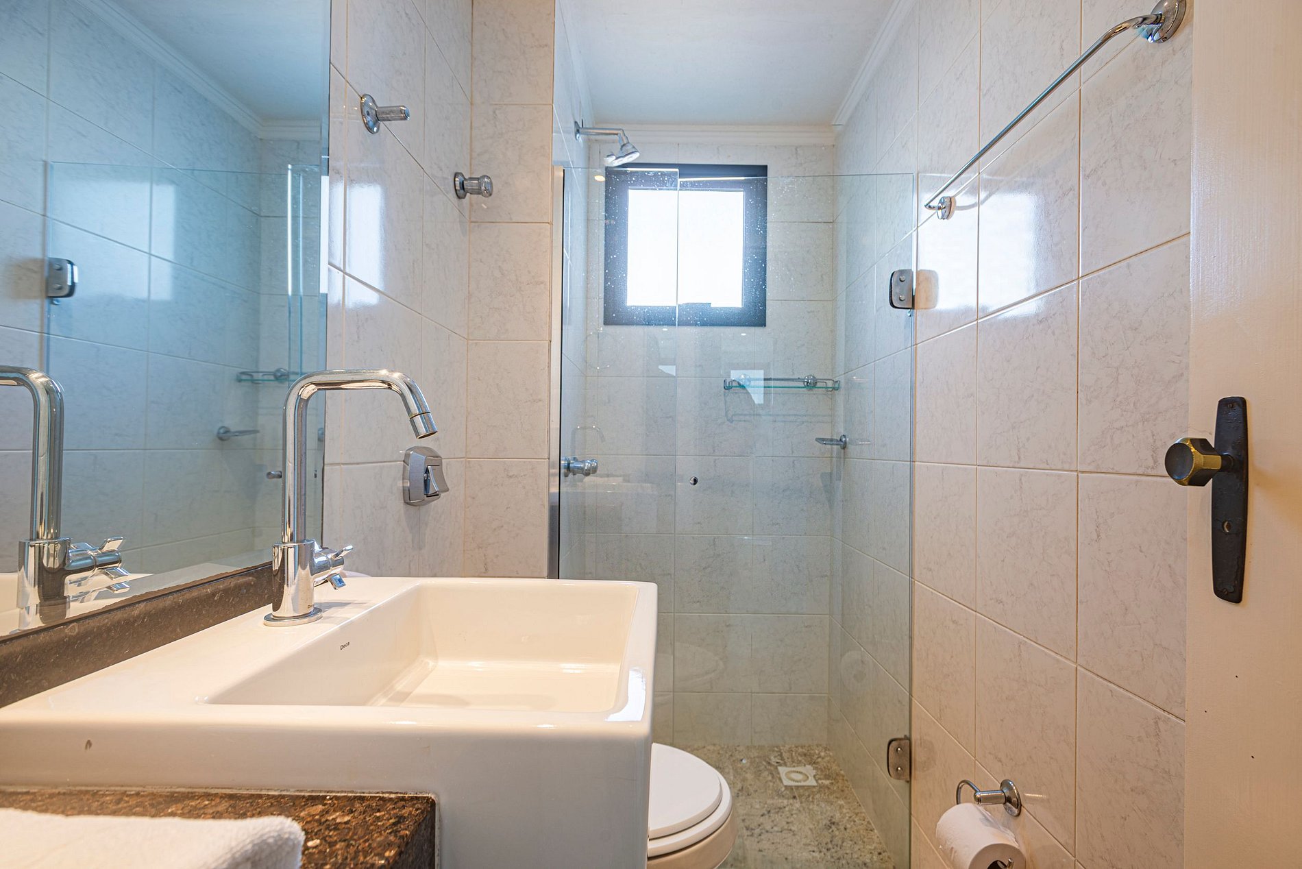 > O apartamento é entregue com 1 rolo de papel higiênico por banheiro para a chegada. Reposições durante a estadia ficam por conta dos hóspedes.