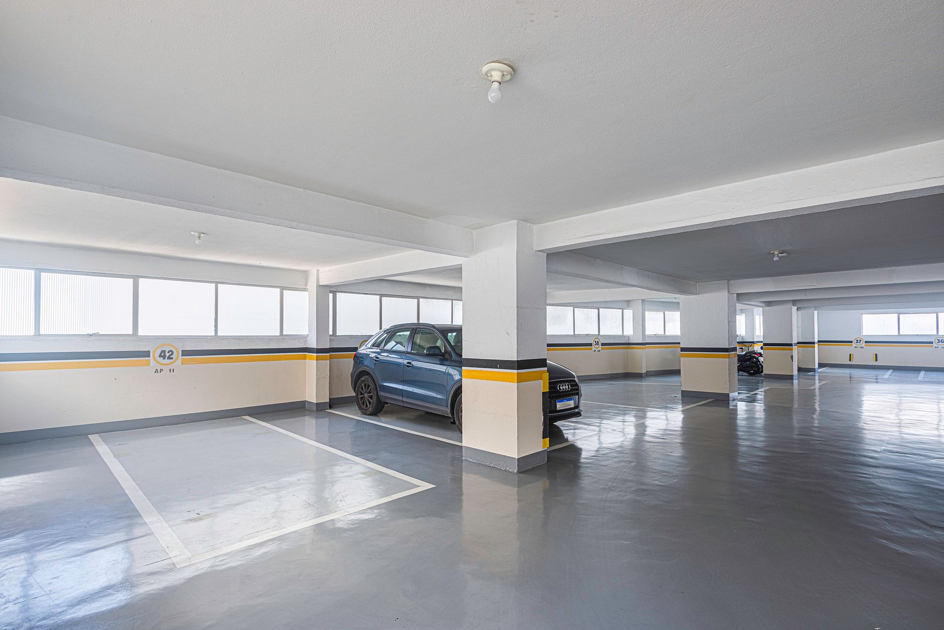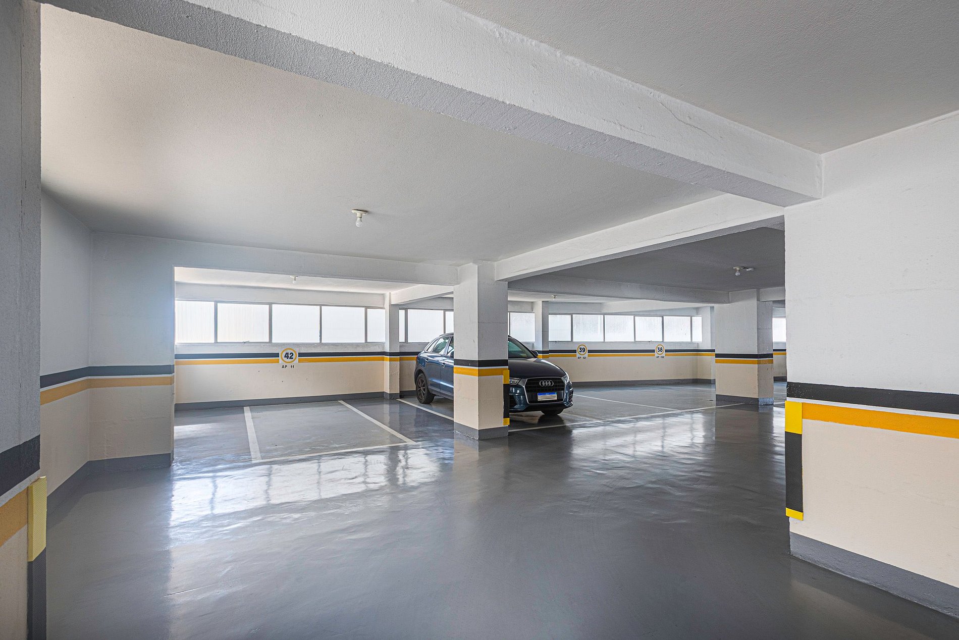 Duas vagas de garagem privativas disponíveis, sendo uma vaga delas mais apertada, destinada a veículo pequenos/médios. Caminhonetes e demais carros grandes podem não ser compatíveis.