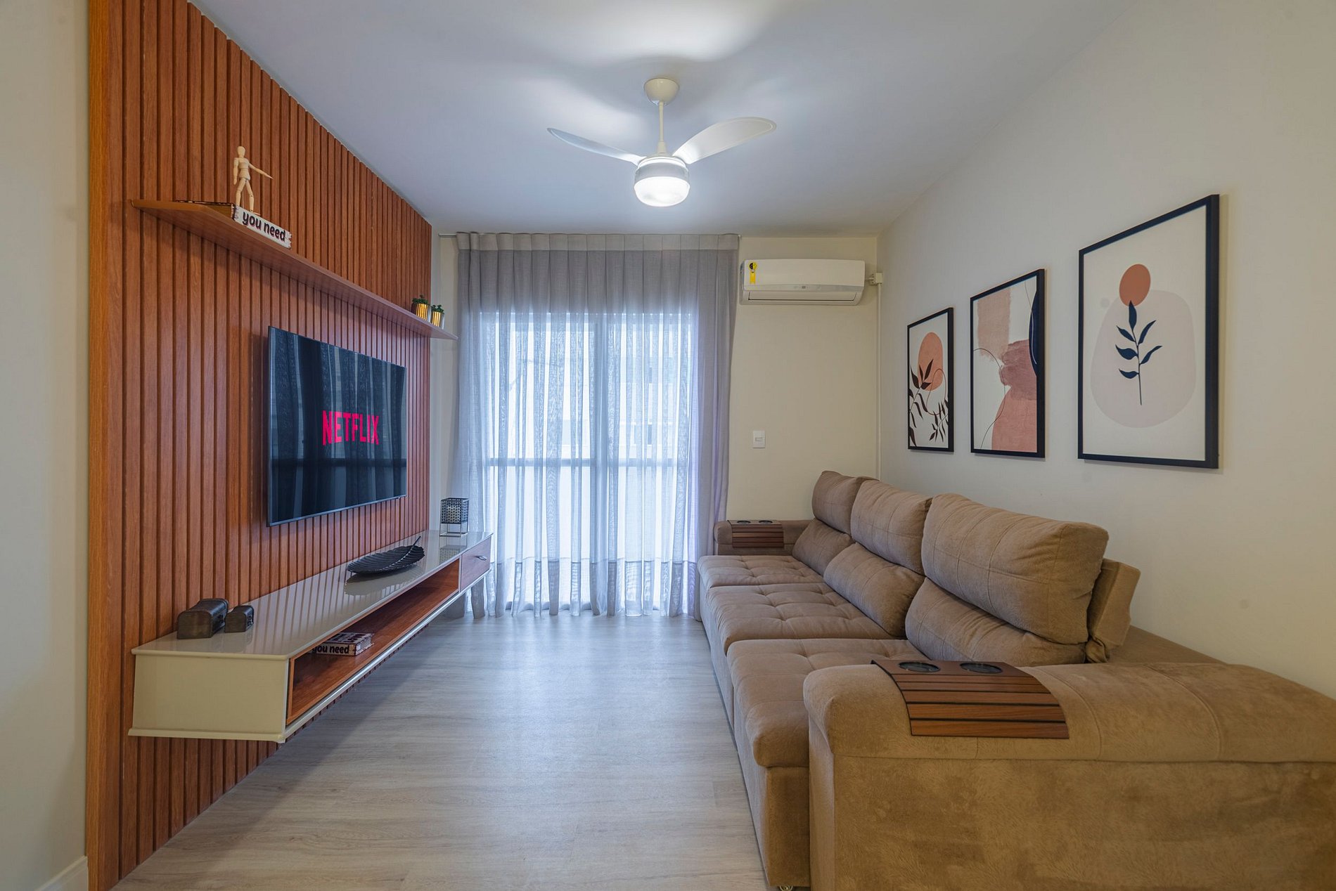A acomodação conta com ar condicionado nas nos dois quartos e também na sala de estar.