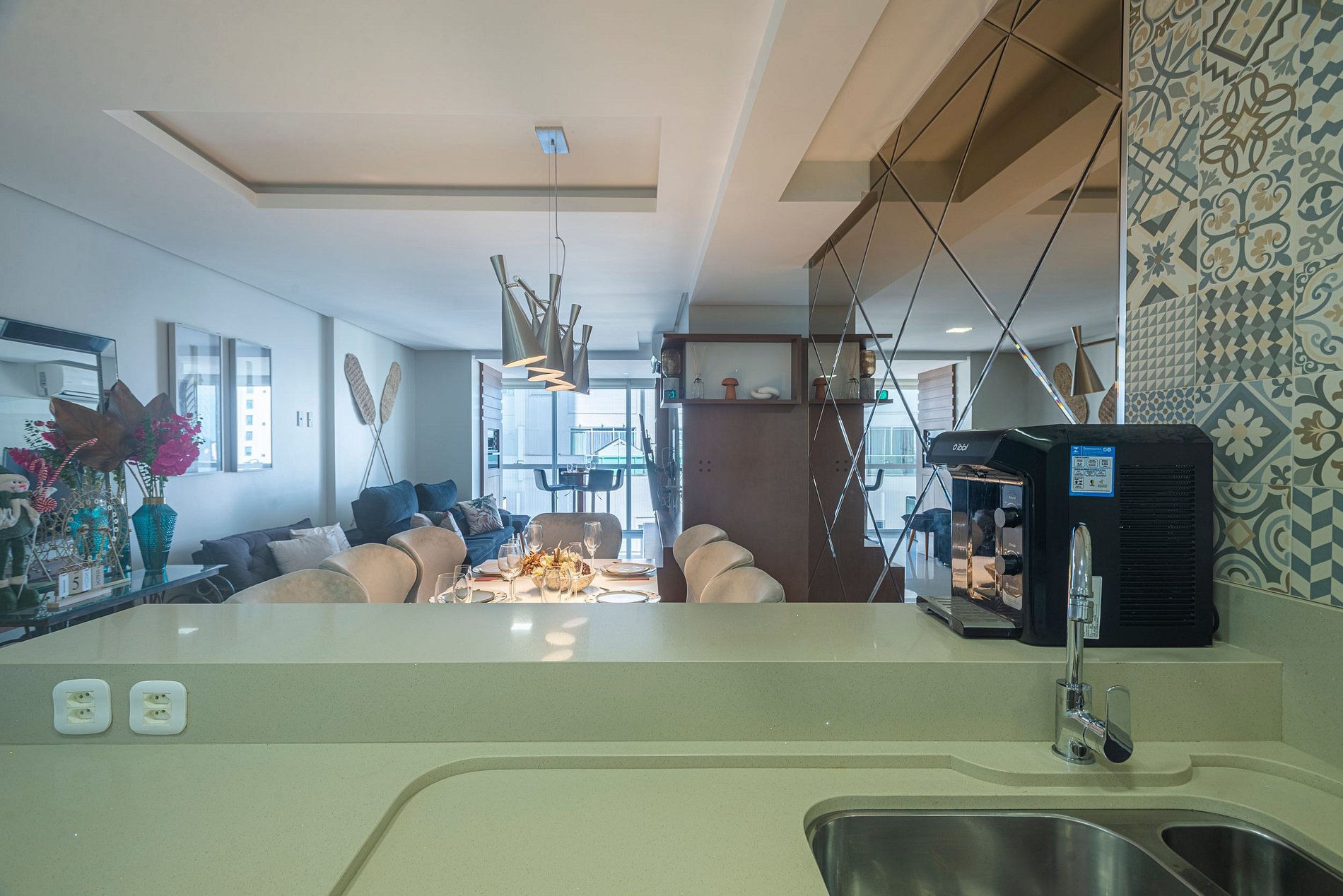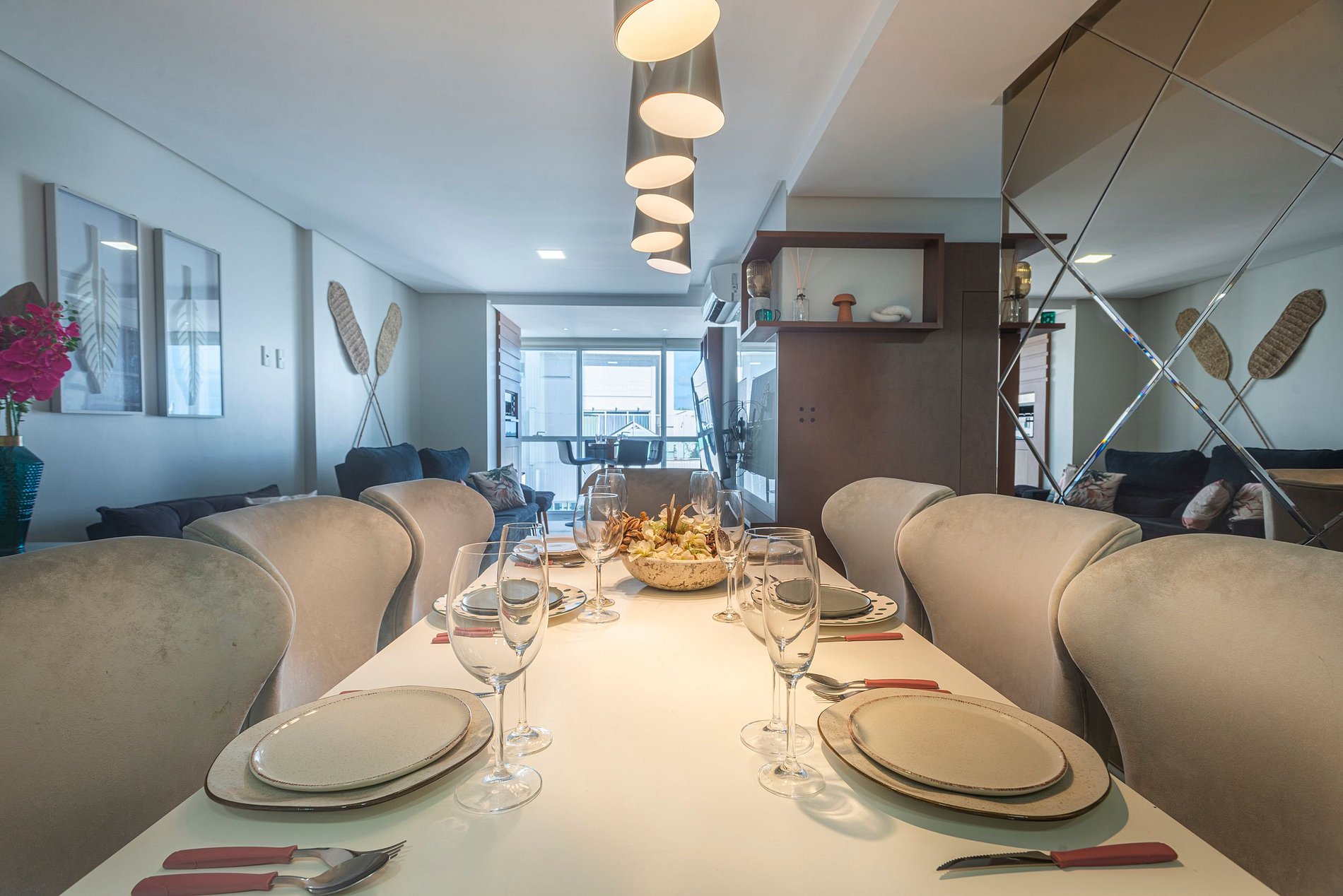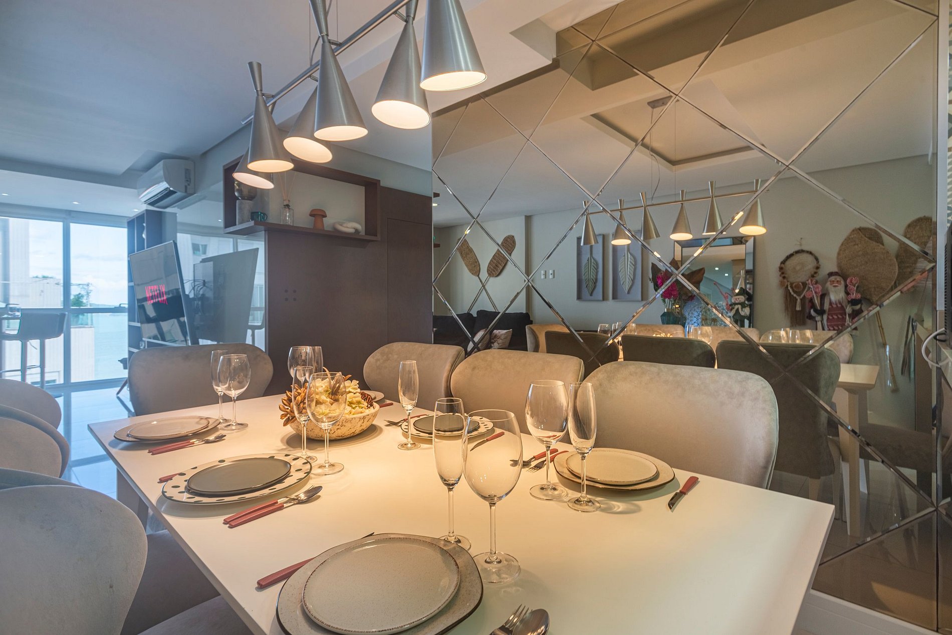 > 3 suítes amplas e confortáveis, todas com ar-condicionado e Smart TV.> Cozinha moderna e completa, equipada com eletrodomésticos e utensílios para que você se sinta em casa. > Sala de estar elegante, climatizada e com Smart TV, espaço ideal para relaxar ou socializar. > Sacada com vista de tirar o fôlego, onde é possível aproveitar momentos inesquecíveis. > Área de serviço privativa, incluindo máquina lava & seca.> Duas vagas de garagem privativas.