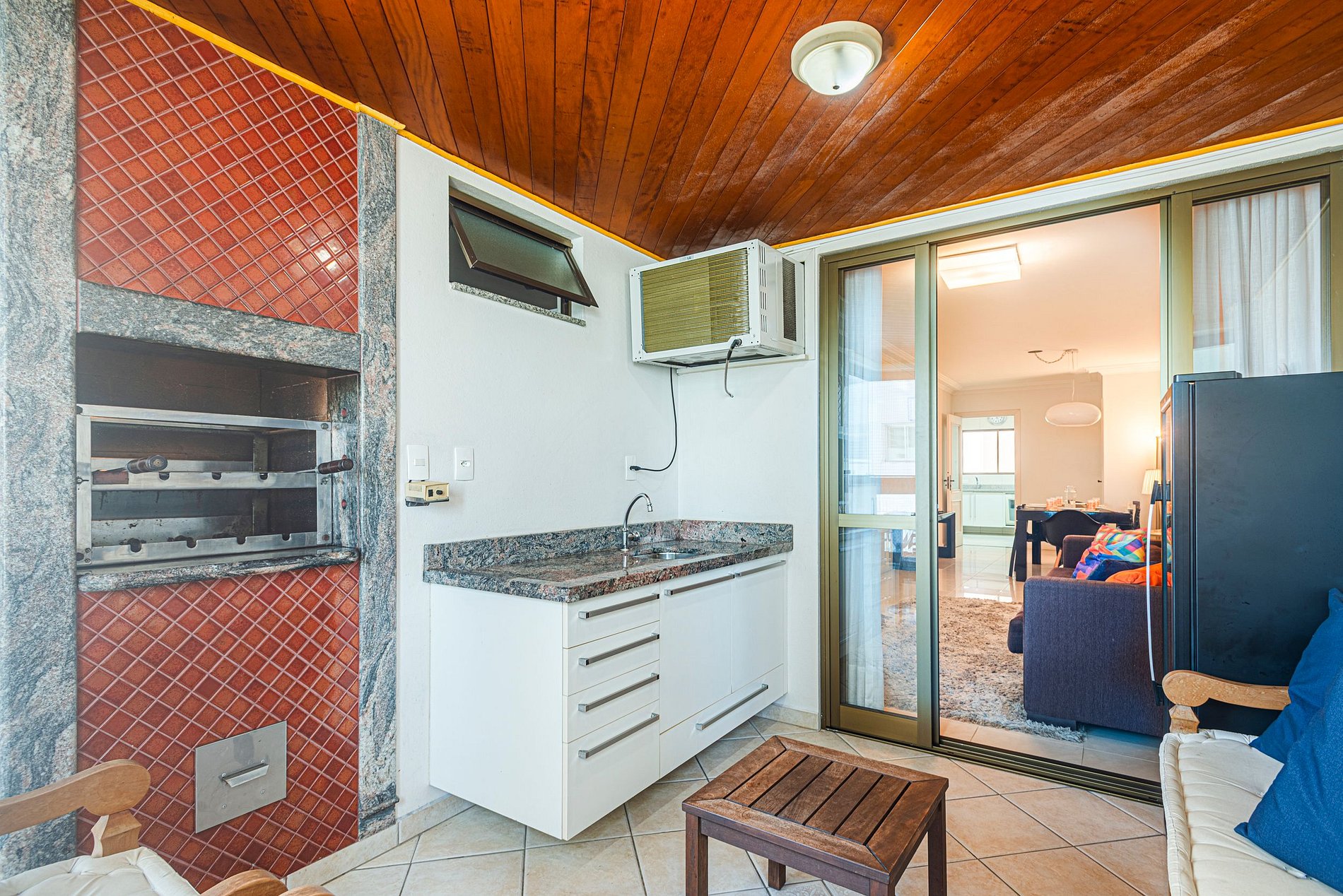 > Sacada ampla com churrasqueira a carvão e pequena vista para o mar;